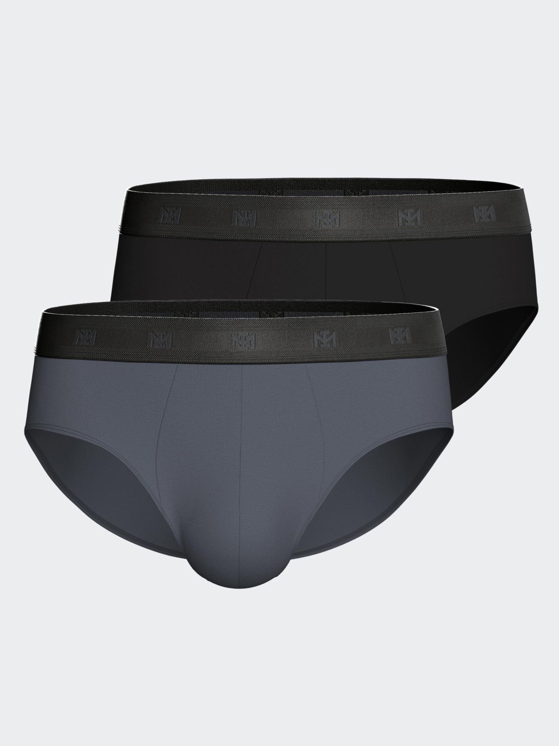 Pack de 2 slips lisos con cintura elástica. Punto ligero y cómodo en Lyocell. Colores gris/negro y azul claro/negro.