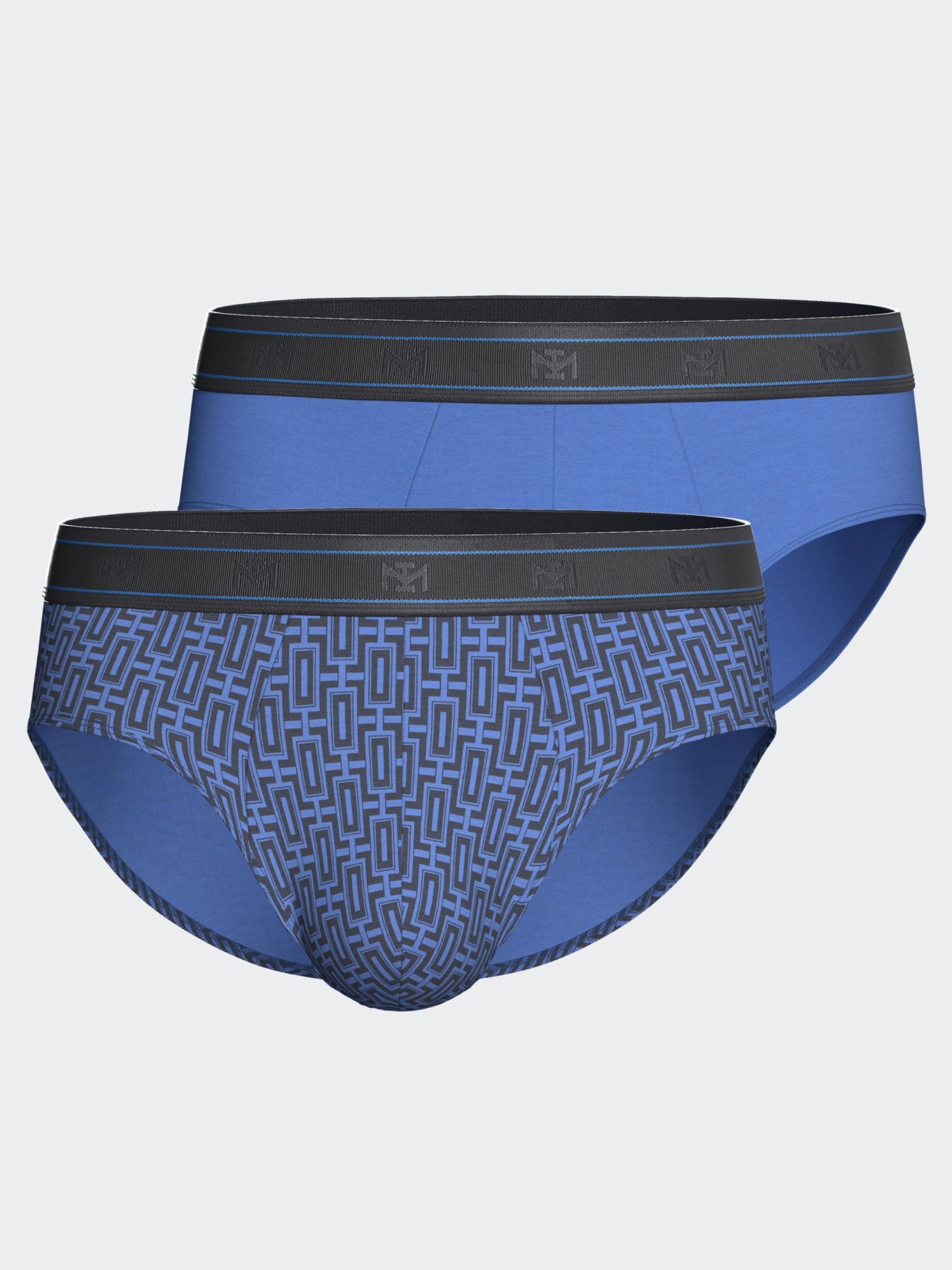 Pack de 2 slips (uno estampado geométrico y otro liso) con cintura elástica. Confeccionado en algodón y modal. Color azul / negro.