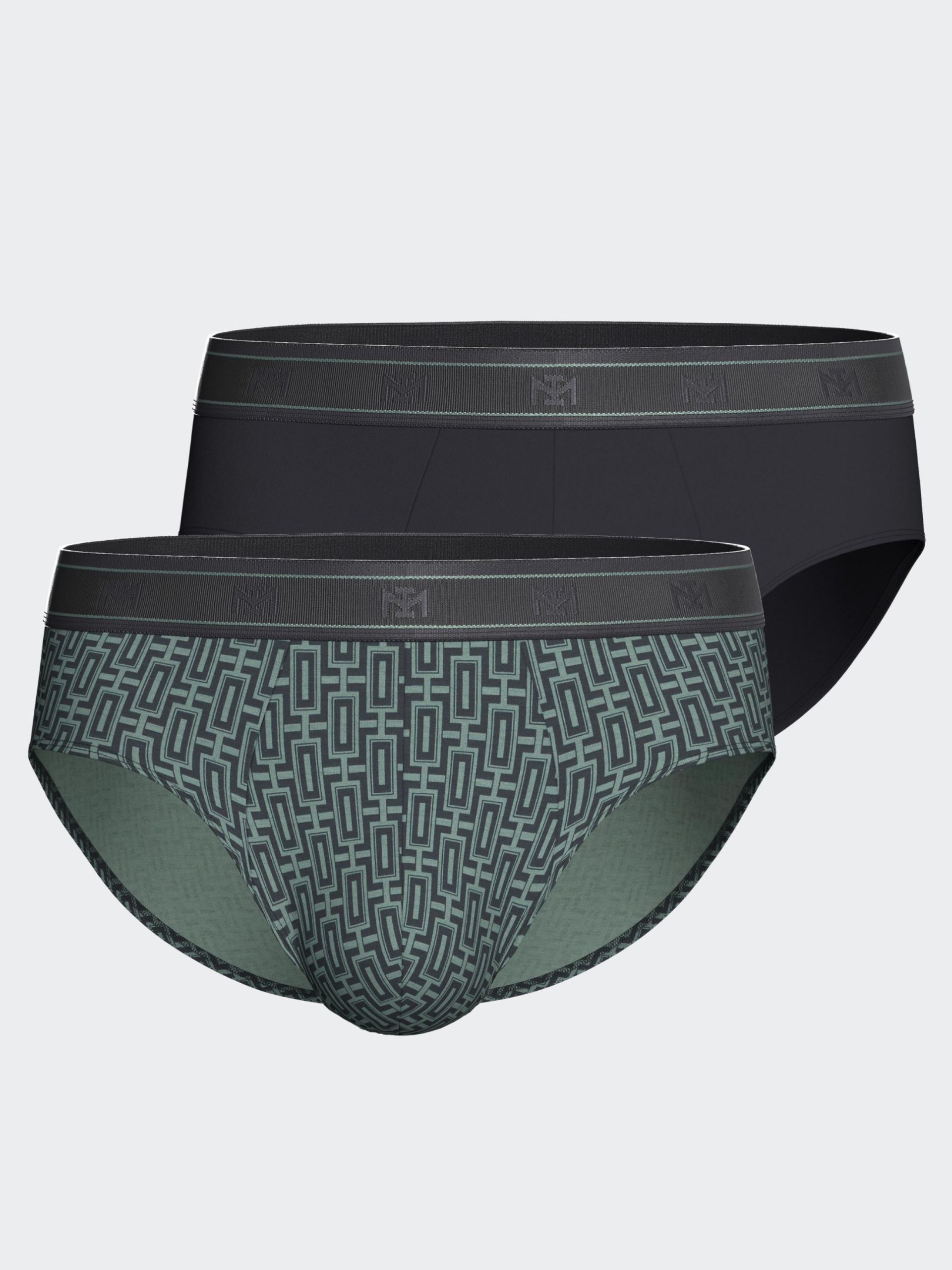 Pack de 2 slips (uno estampado geométrico y otro liso) con cintura elástica. Confeccionado en algodón y modal. Color verde / negro.