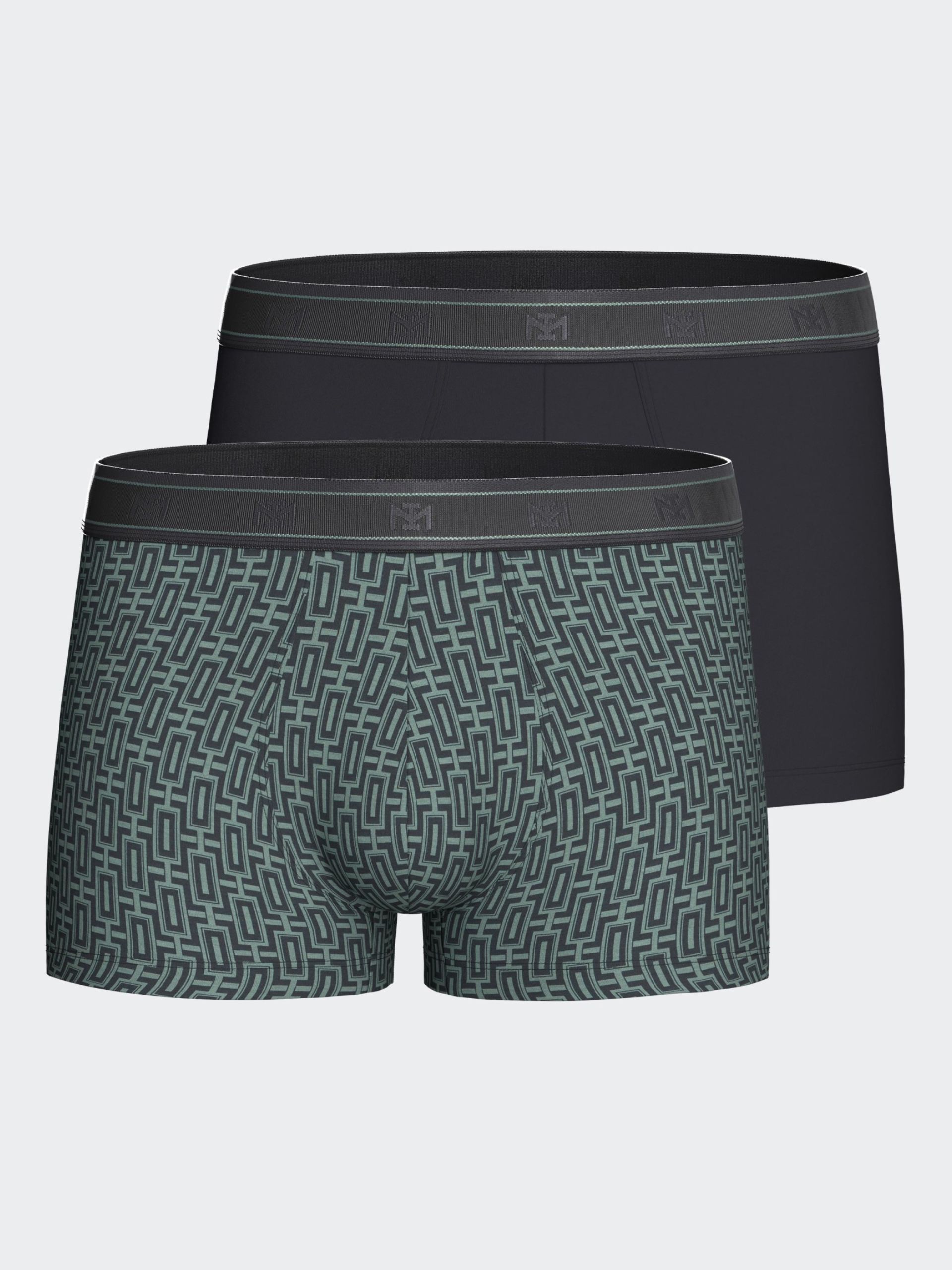Pack de 2 boxers (uno estampado geométrico y otro liso) con cintura elástica. Algodón y modal. Colores:  verde/negro y azul/negro.