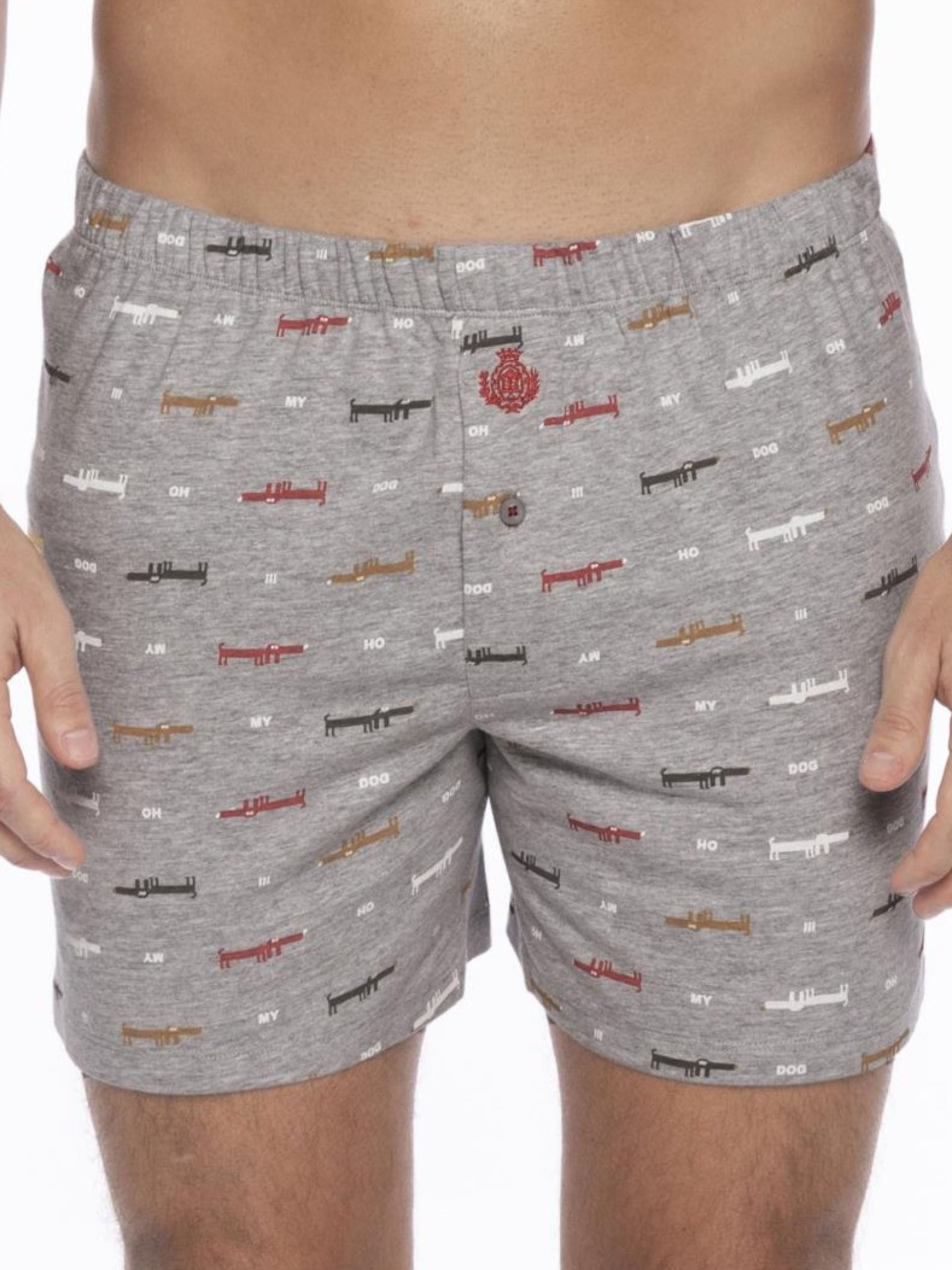 Bóxer de punto 100% algodón. Color gris melange con divertido estampado de perros salchicha.
