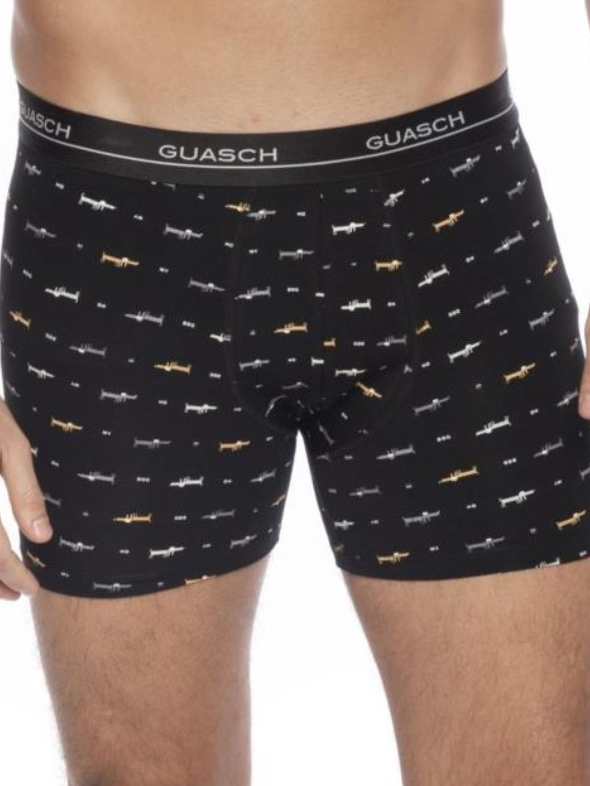 Pack de 2 bóxers estampados. 95% algodón. Uno verde con aviones y uno negro con perros salchicha.