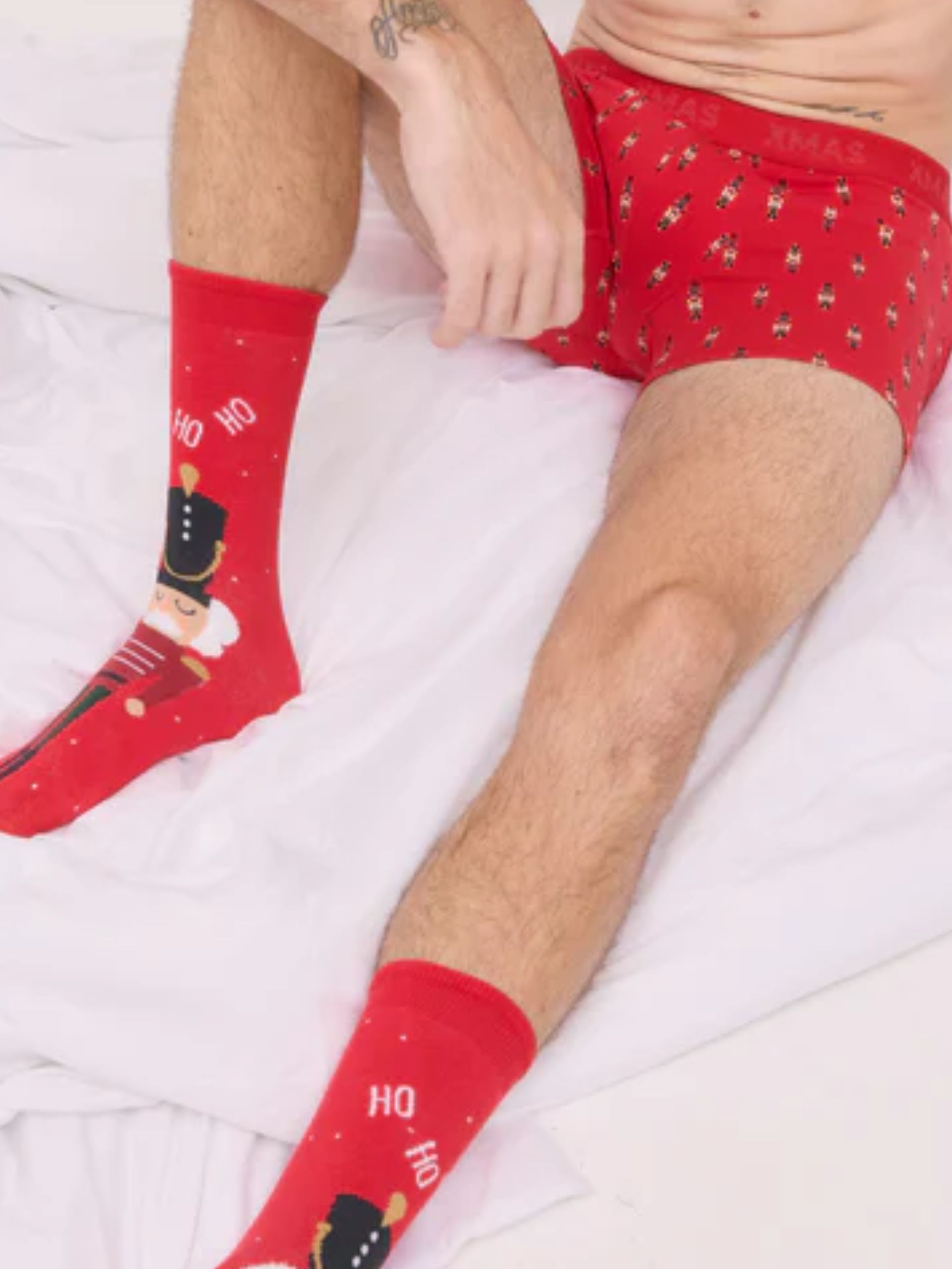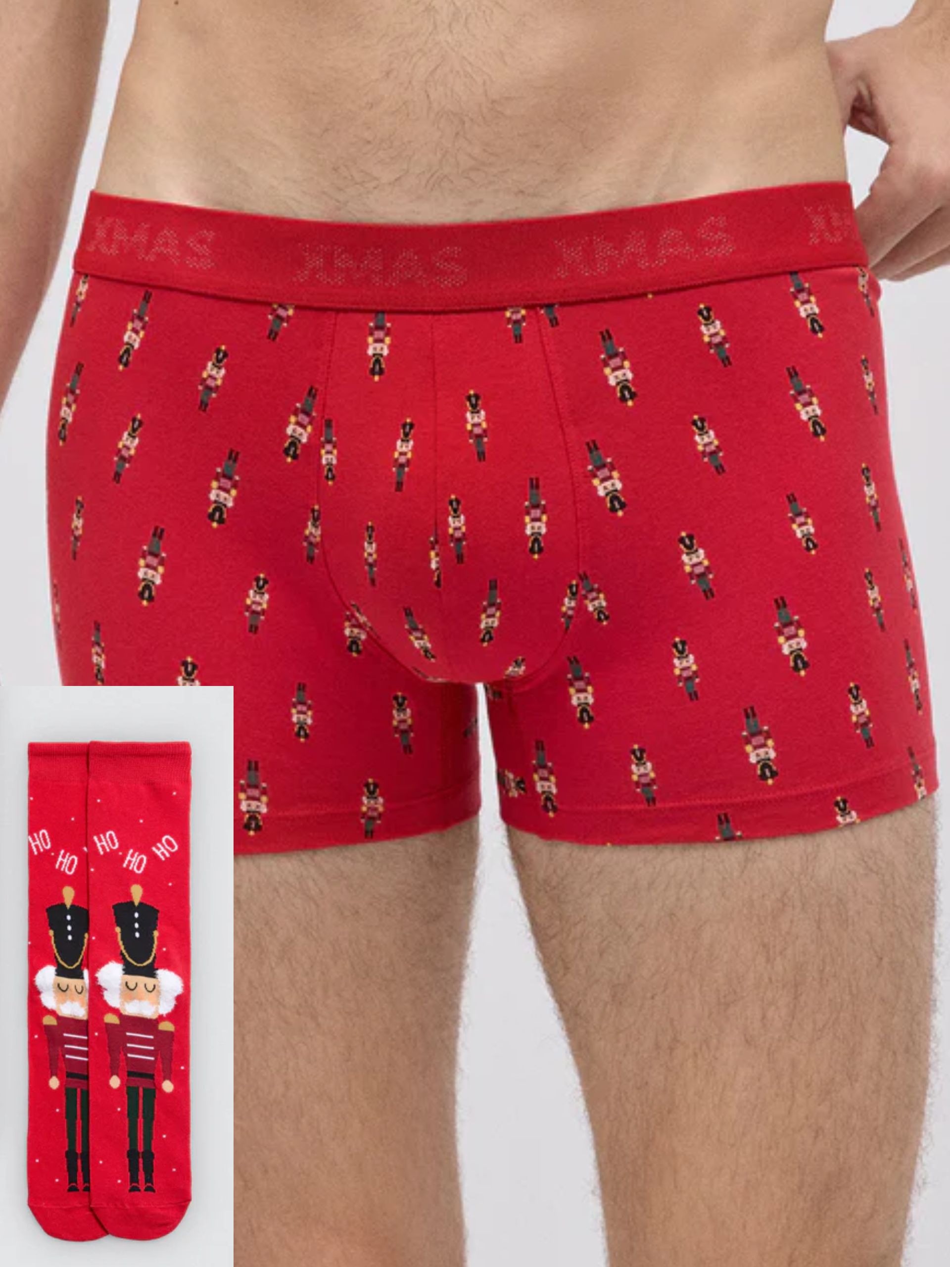 Pack bóxer y calcetines navideños. Estampado cascanueces sobre fondo rojo.
