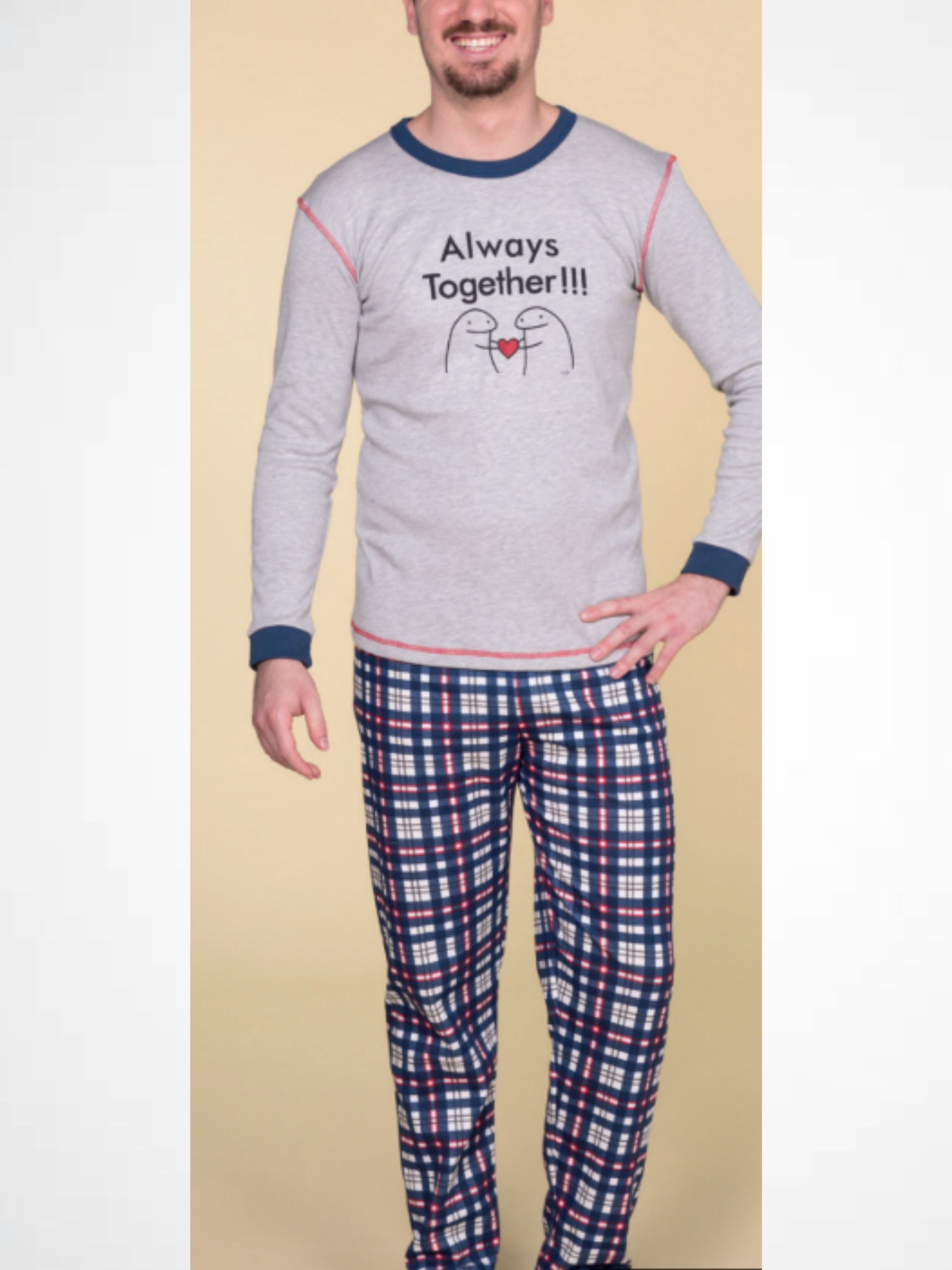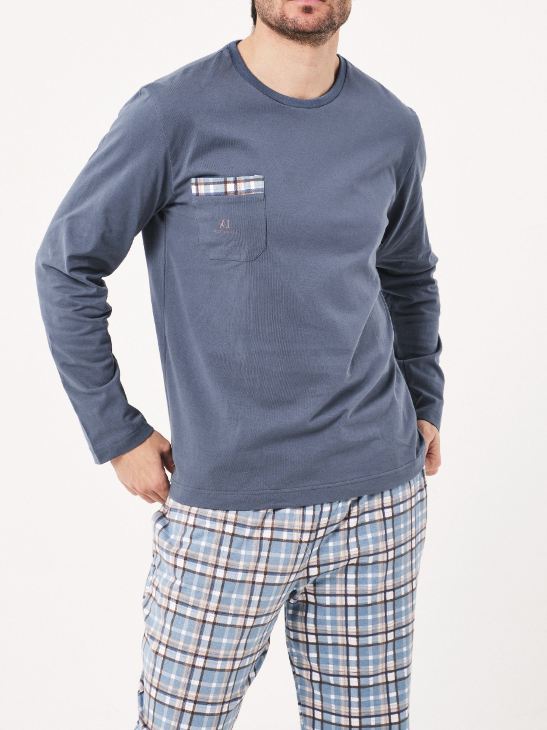 Pijama mixto de punto y viyella. Pantalón con cuadro escoces, estilo tartán.