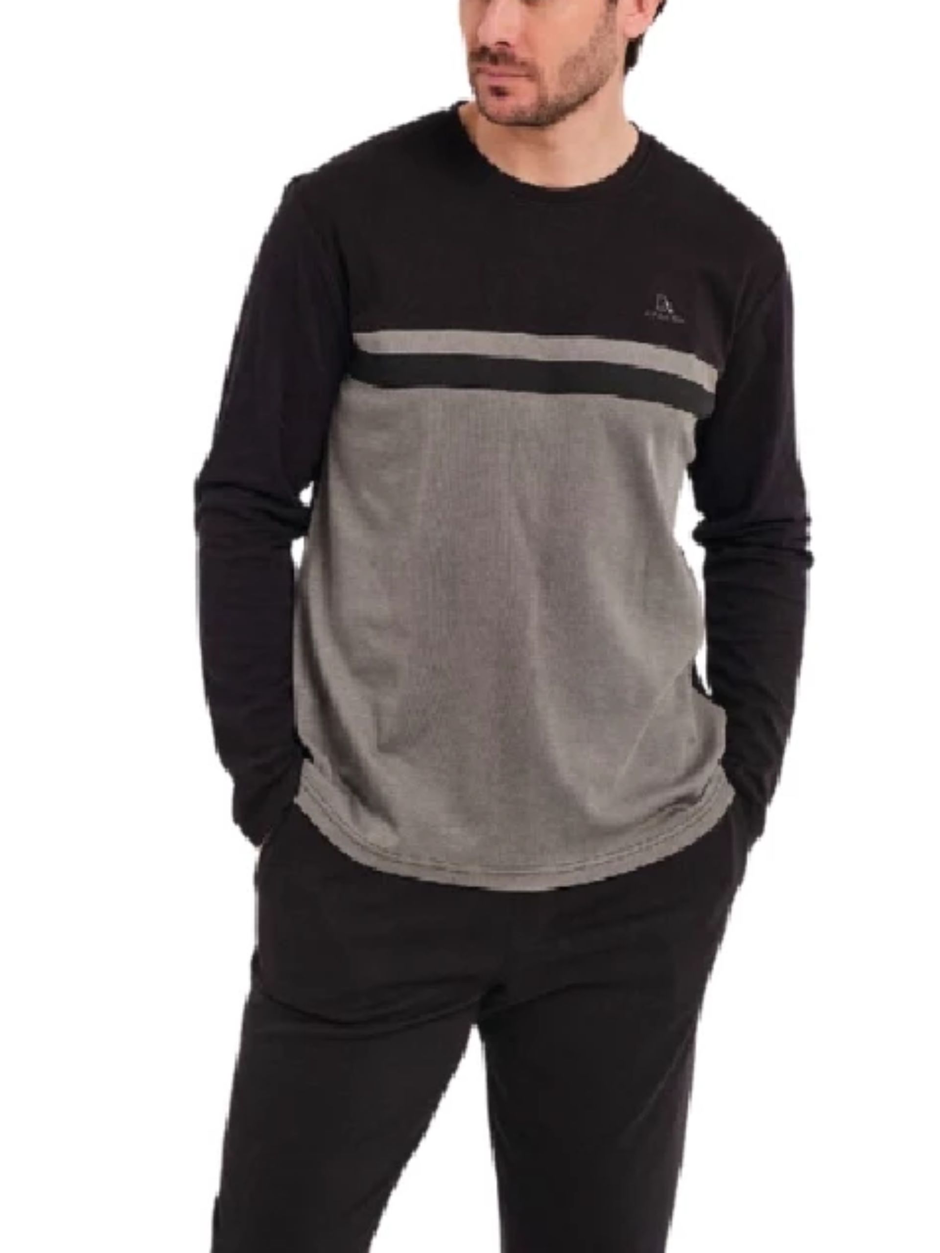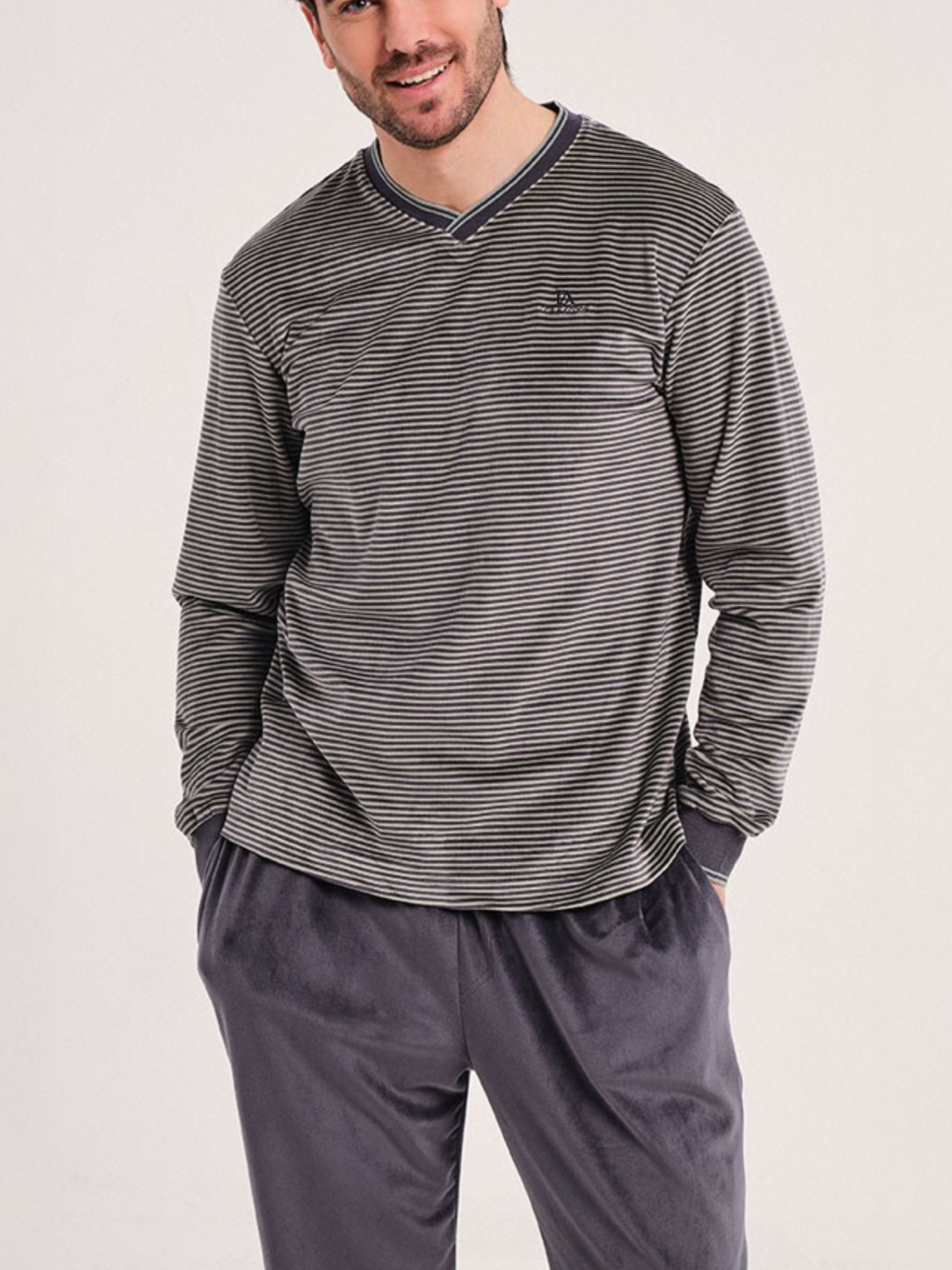 Pijama largo en tonos grises. Camiseta estampada con rayas y cuello pico. Pantalón liso con bolsillos.