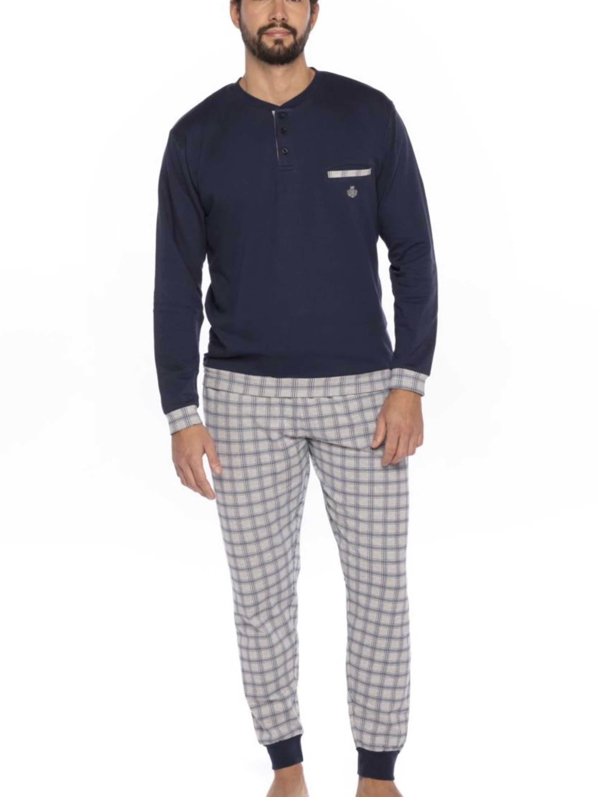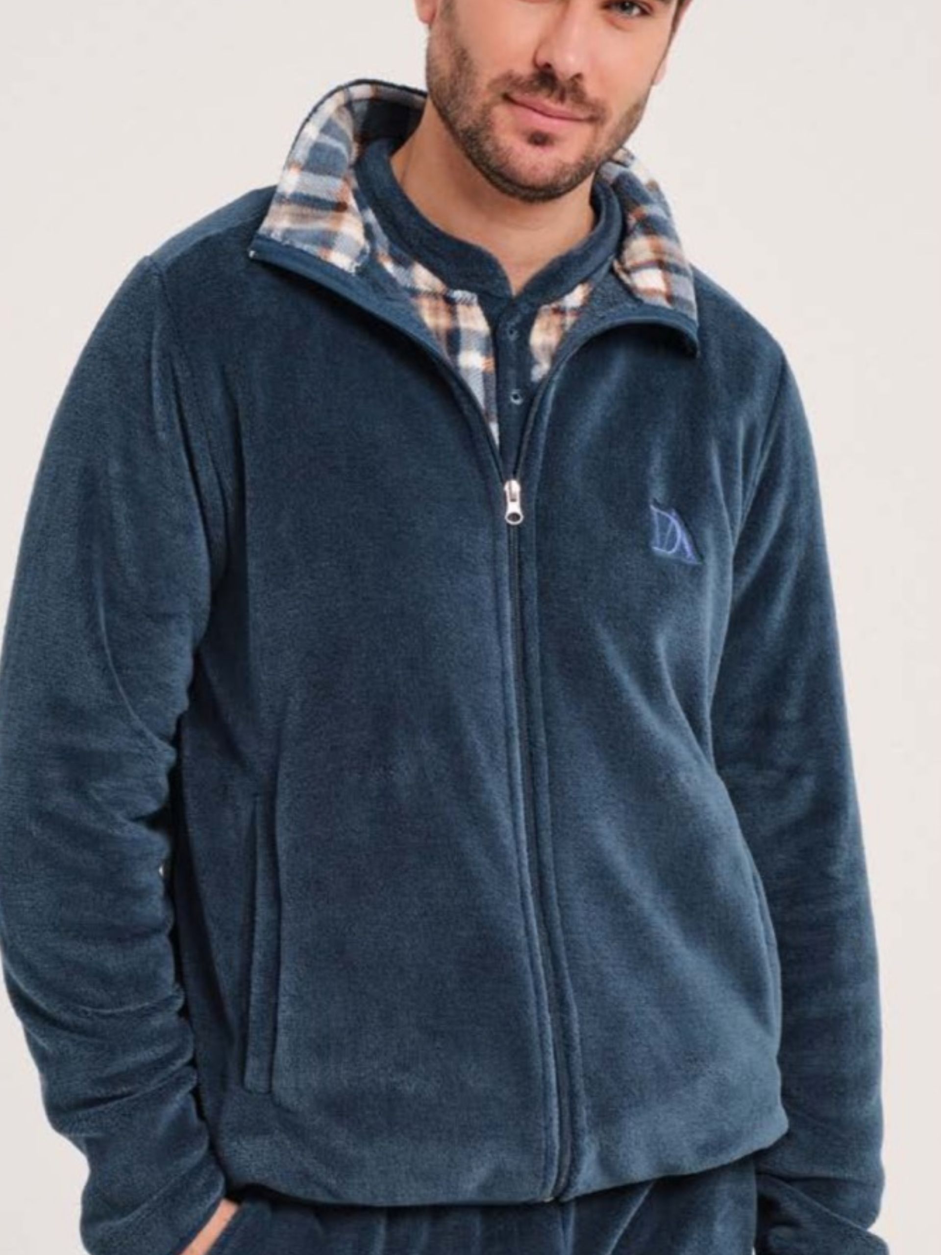 Pijama de felpa. Camiseta lisa azul marino, cuello panadero y detalle de puños, coderas y cintura en cuadros a juego con pantalón estampado con puños. Algodón 100%.