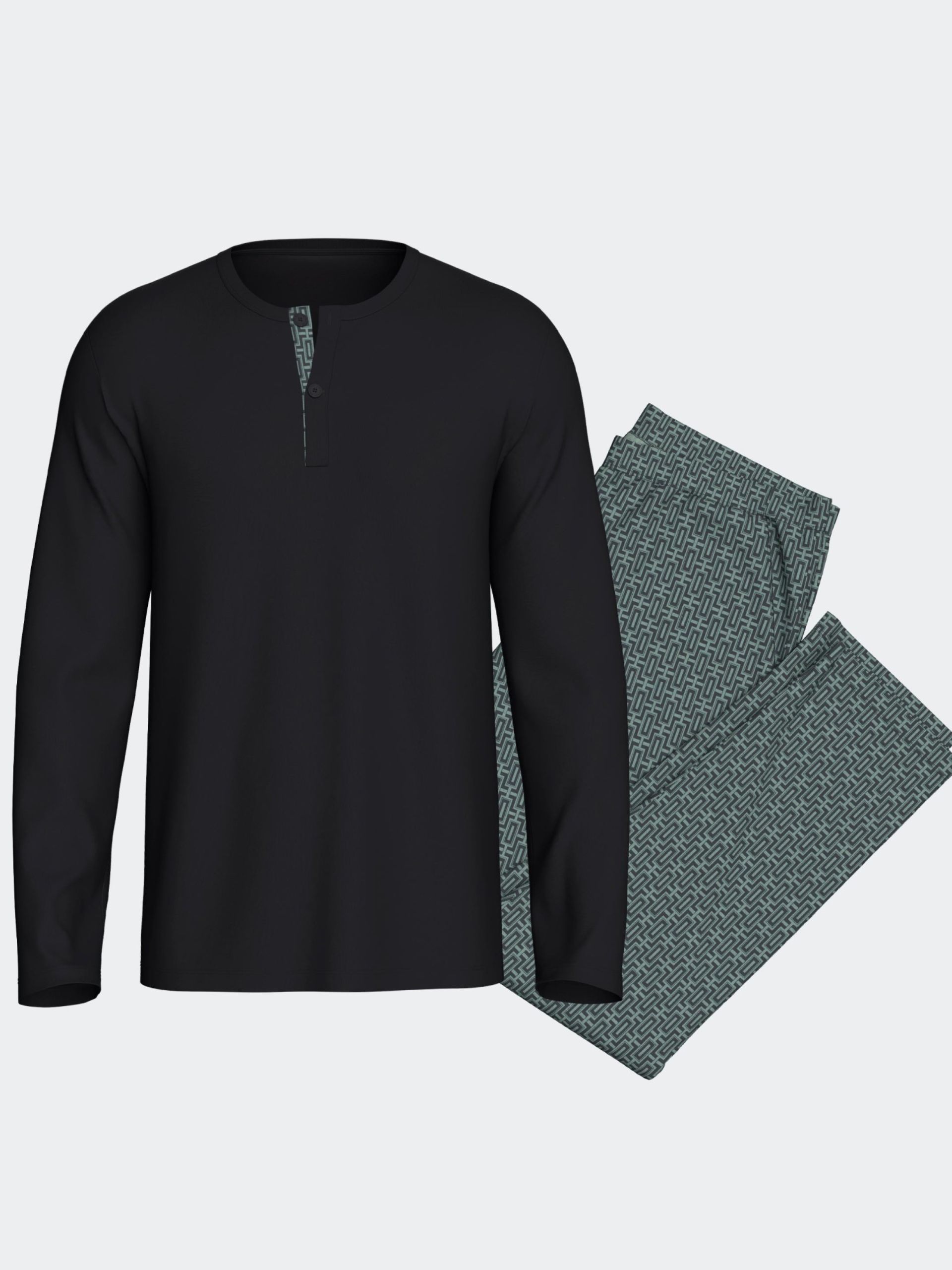 Pijama de carda en algodón y modal. Camiseta lisa con tapeta y pantalón estampado geométrico y bolsillos.