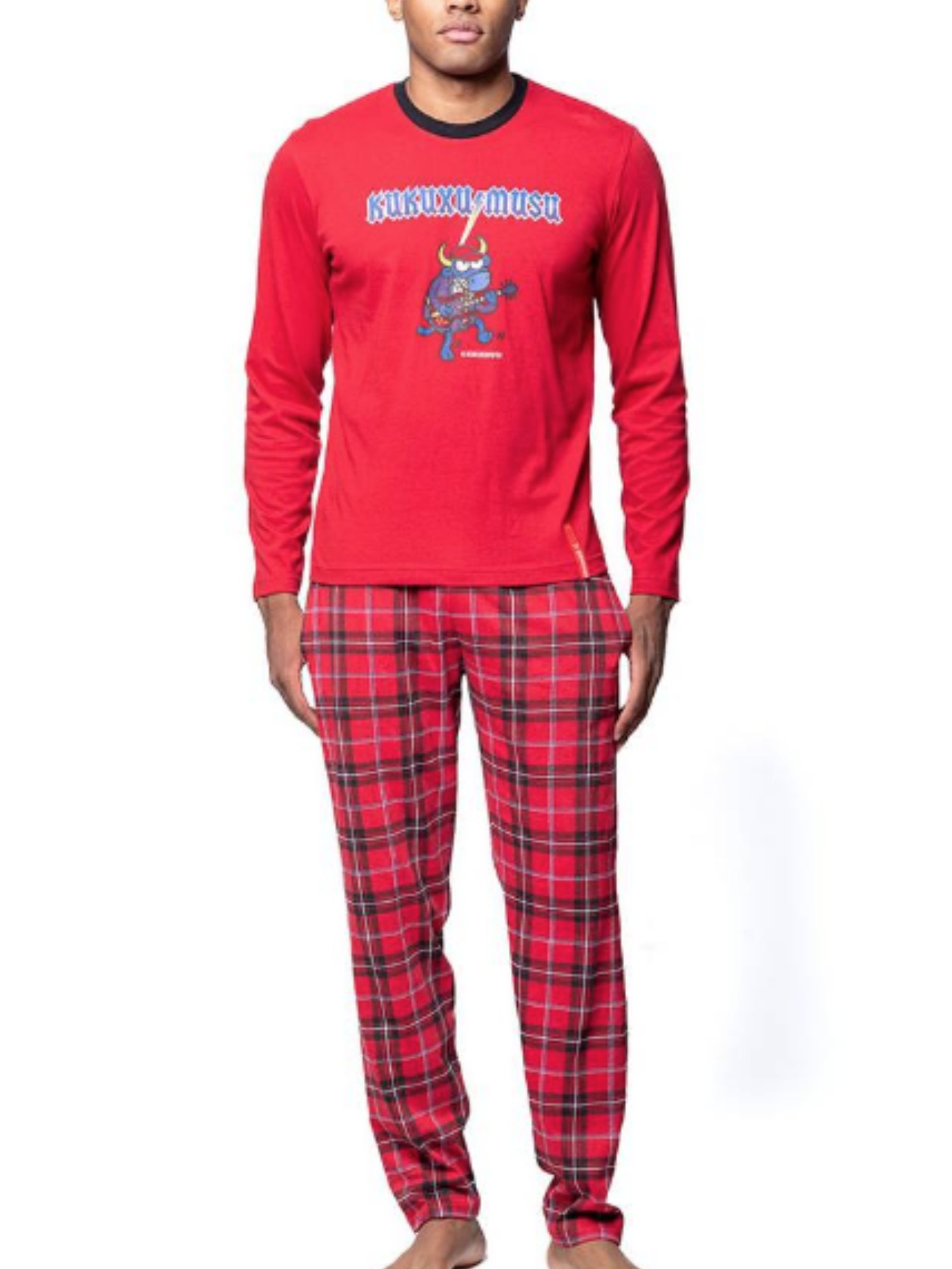Pijama pantalón estampado a cuadros cn bolsillos y camiseta lisa roja con cuello redondo y estampado rock DC/AN.