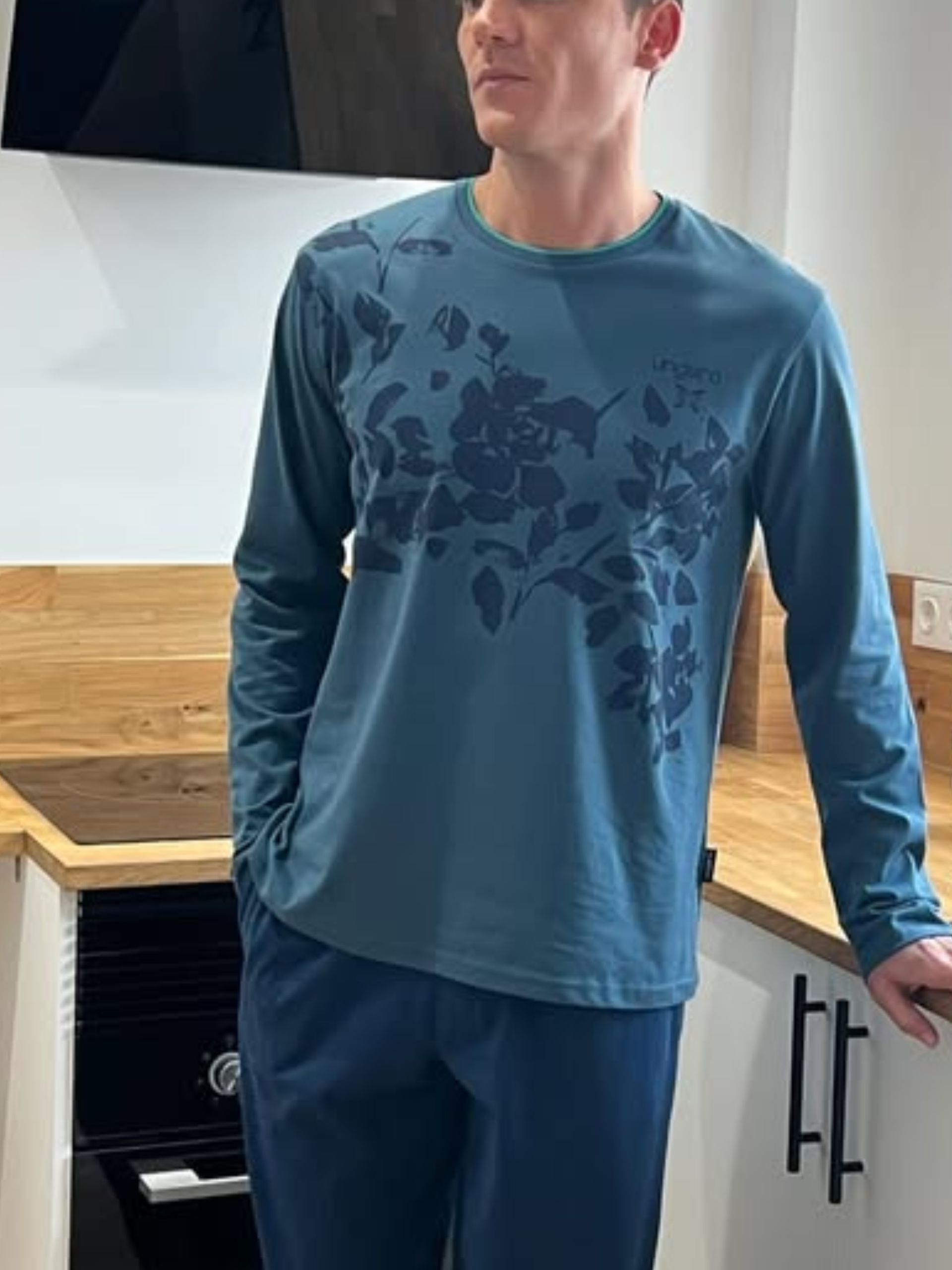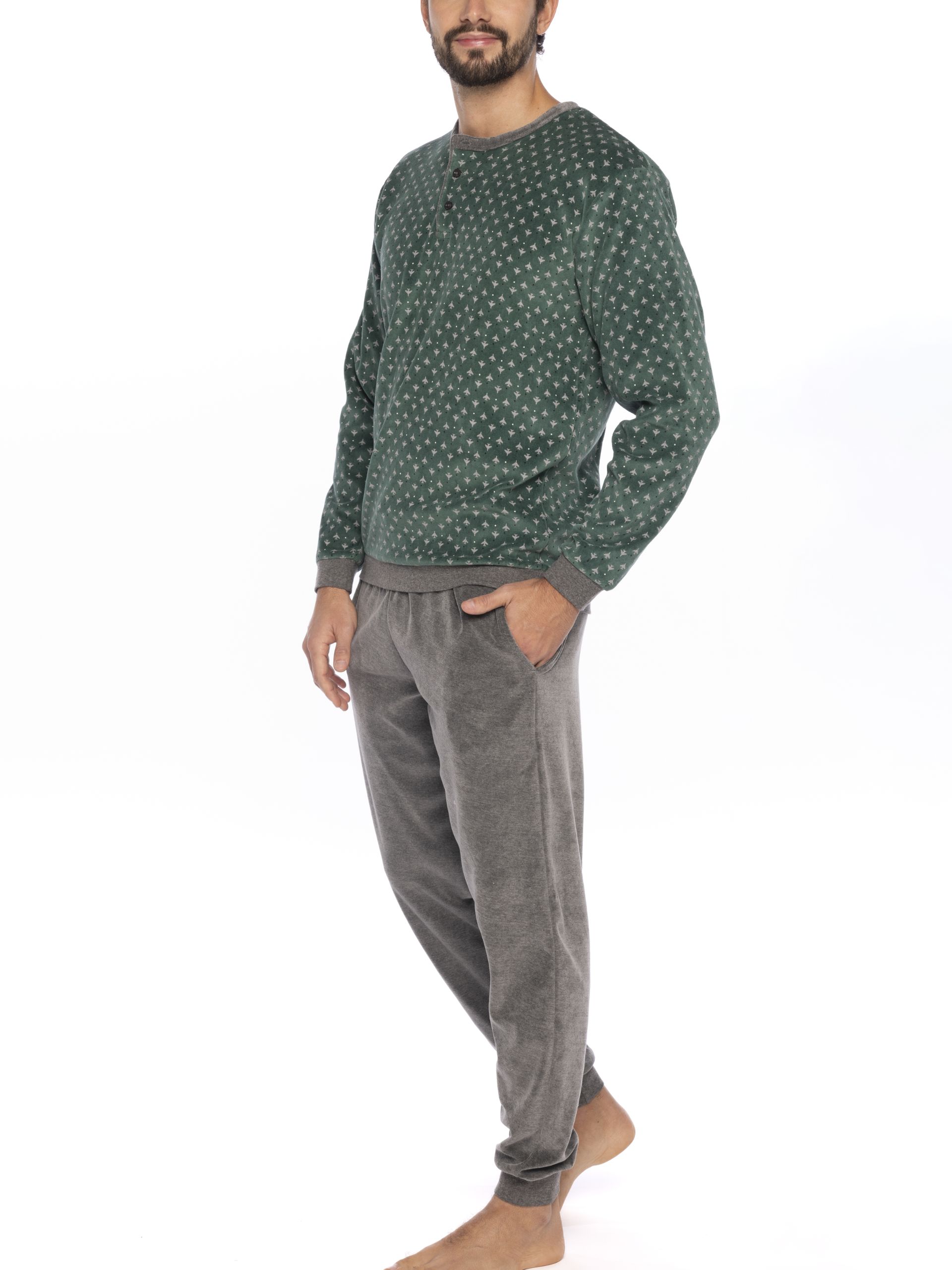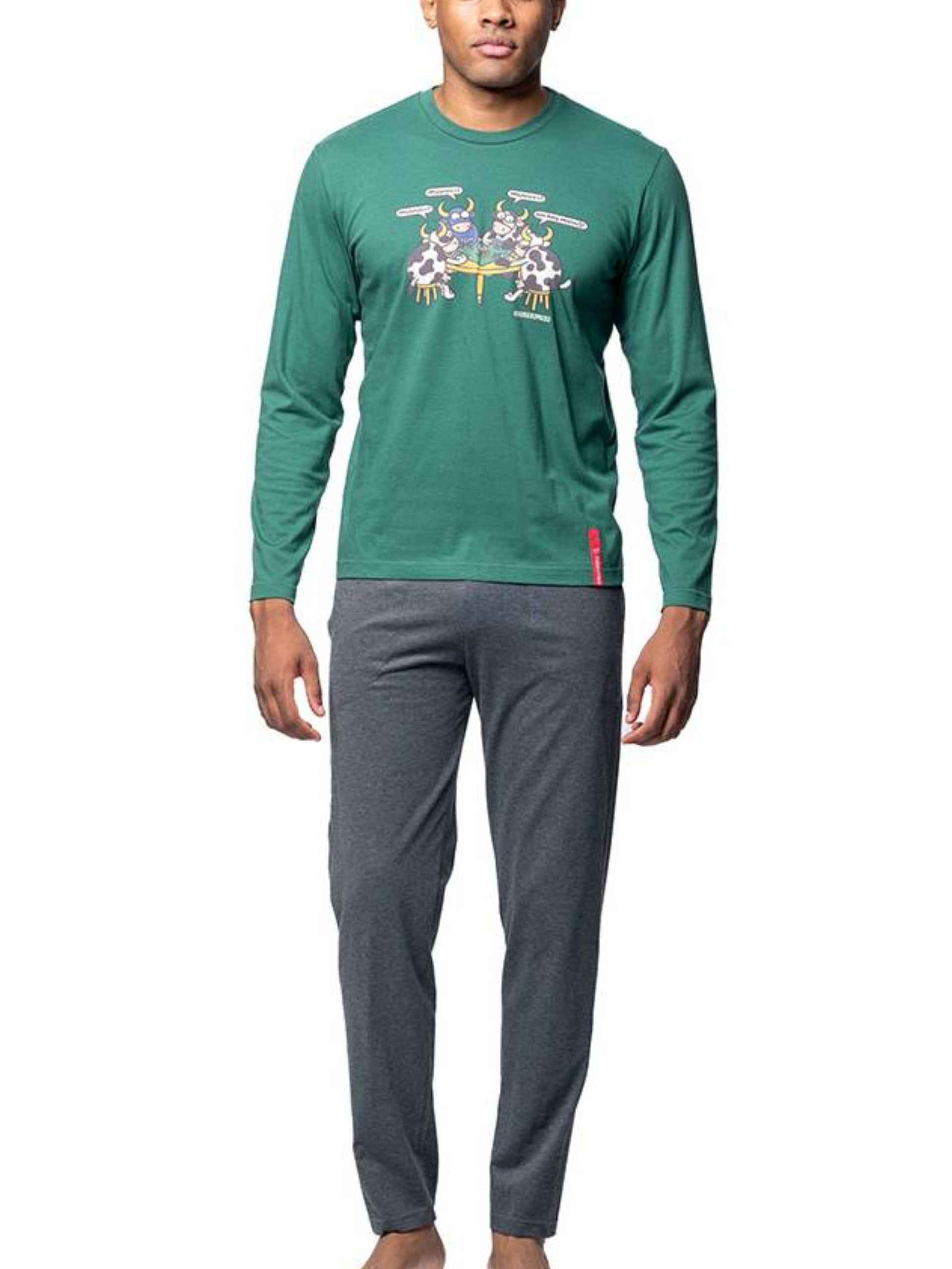Pijama largo liso pantalón gris y camiseta verde con cuello redondo y estampado en el pecho con el juego del mus.