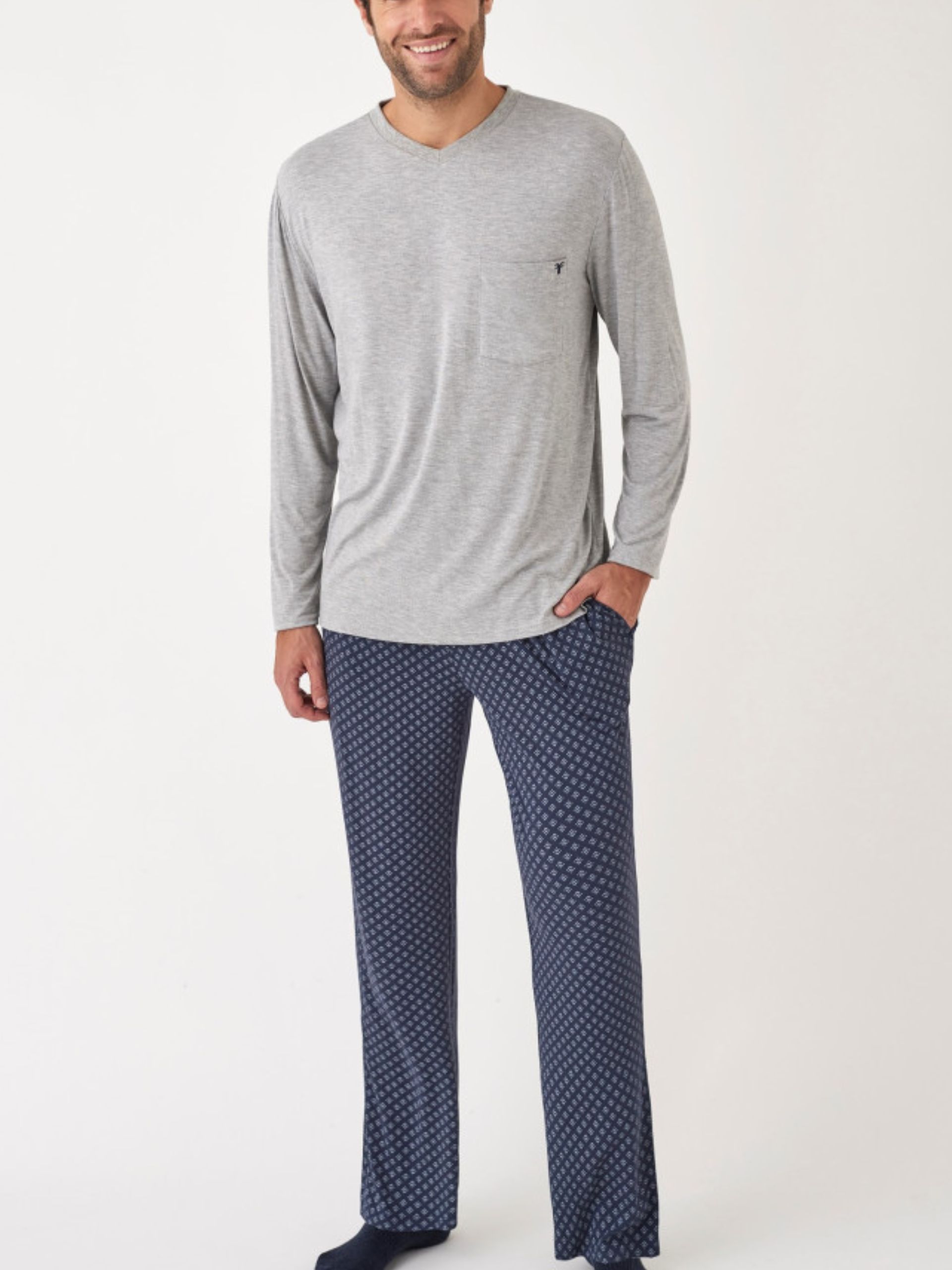Pijama de punto estampado geométrico cuello pico y pantalón con bolsillos . Mezcla de algodón y Lyocell. Máxima comodidad.