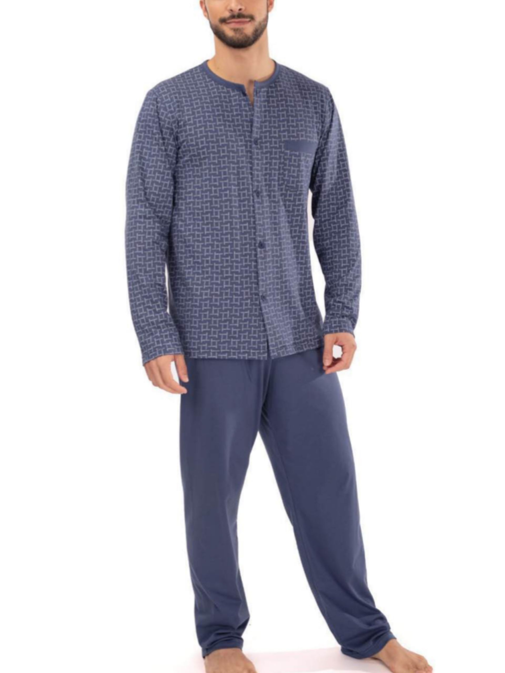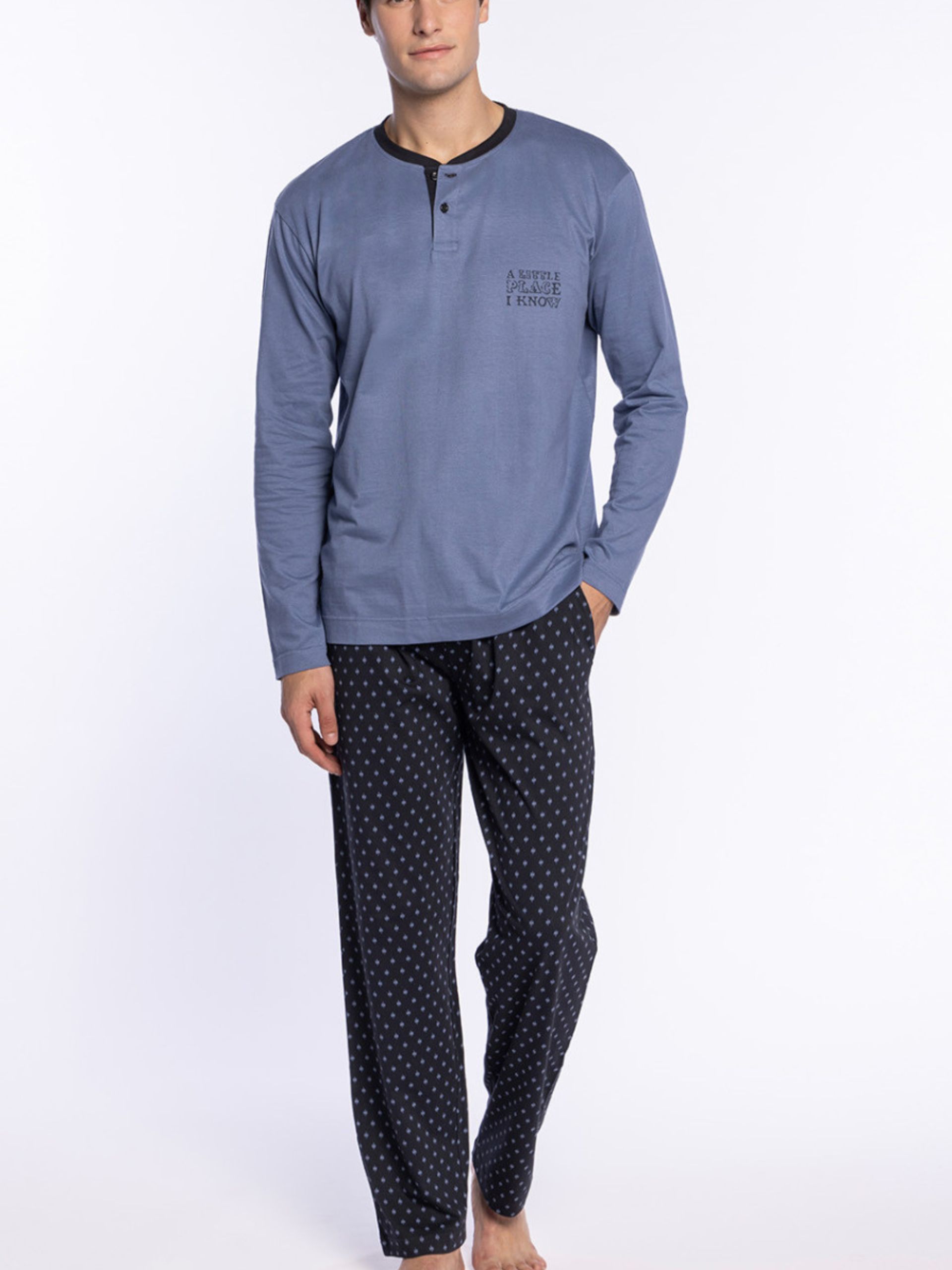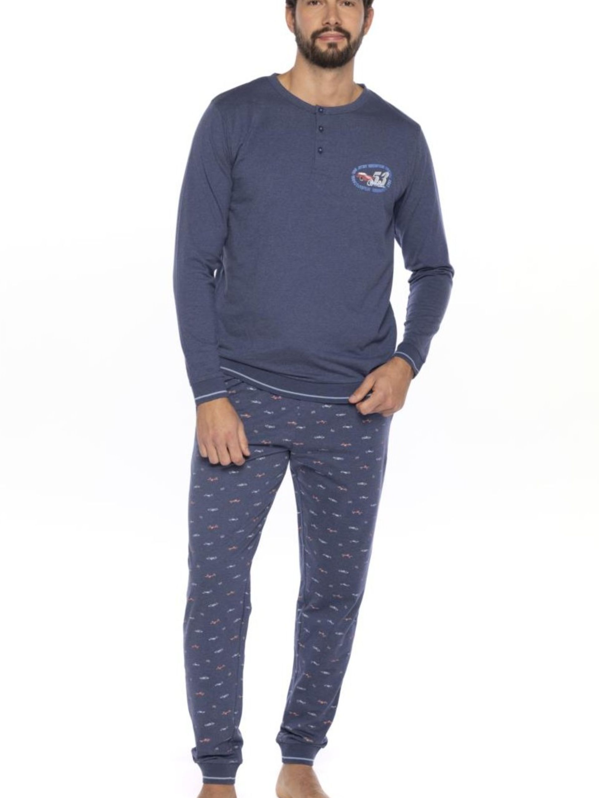 Pijama largo de algodón 100%. Camiseta con cuello redondo y botones. Pantalón estampado, con bolsillos y cintura ajustable.