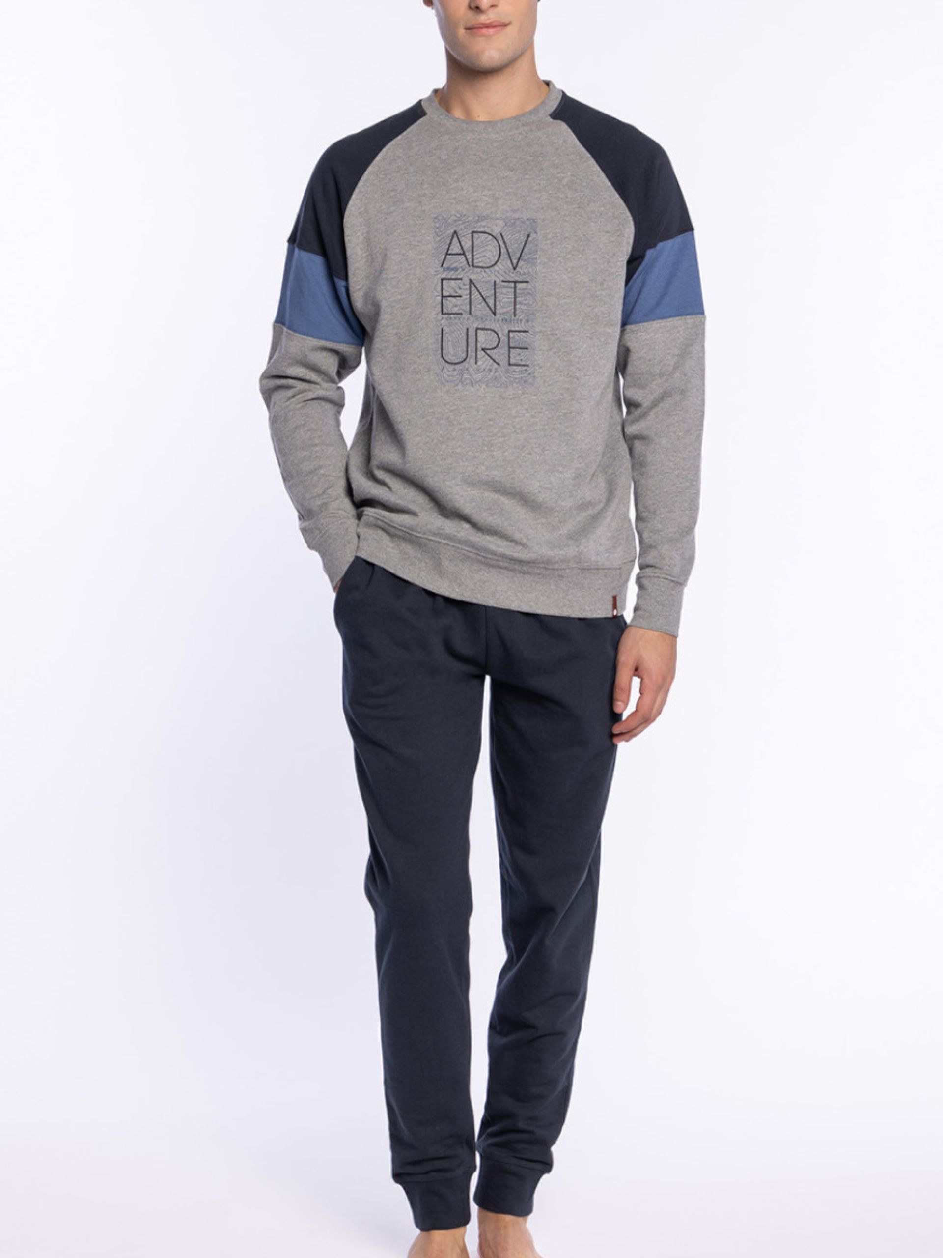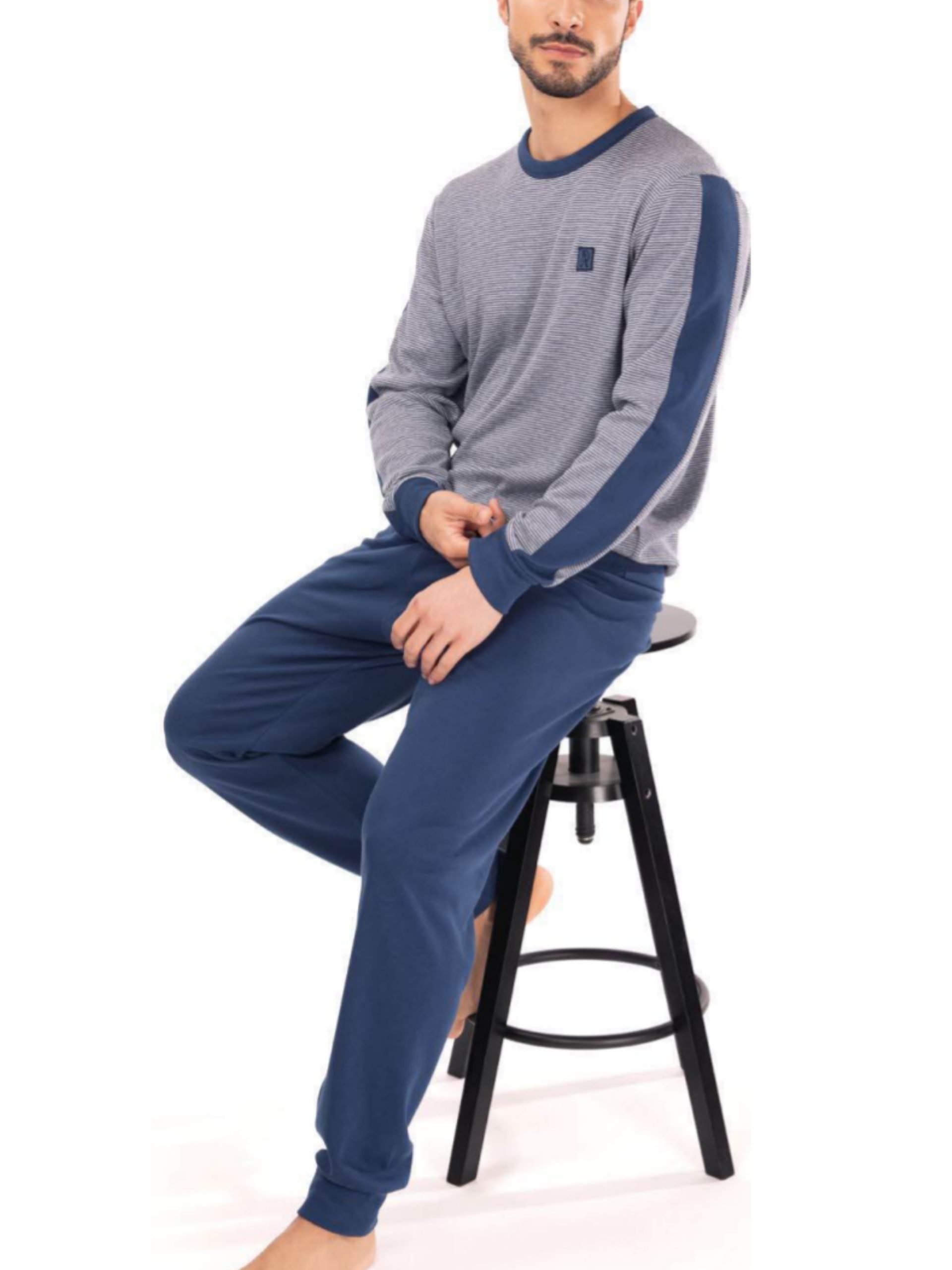 Pijama interlock 50% algodón y 50% poliester. Camiseta cuello redondo, estampada a rayas gris y azul, con puños. Pantalón liso azul a juego con puños.
