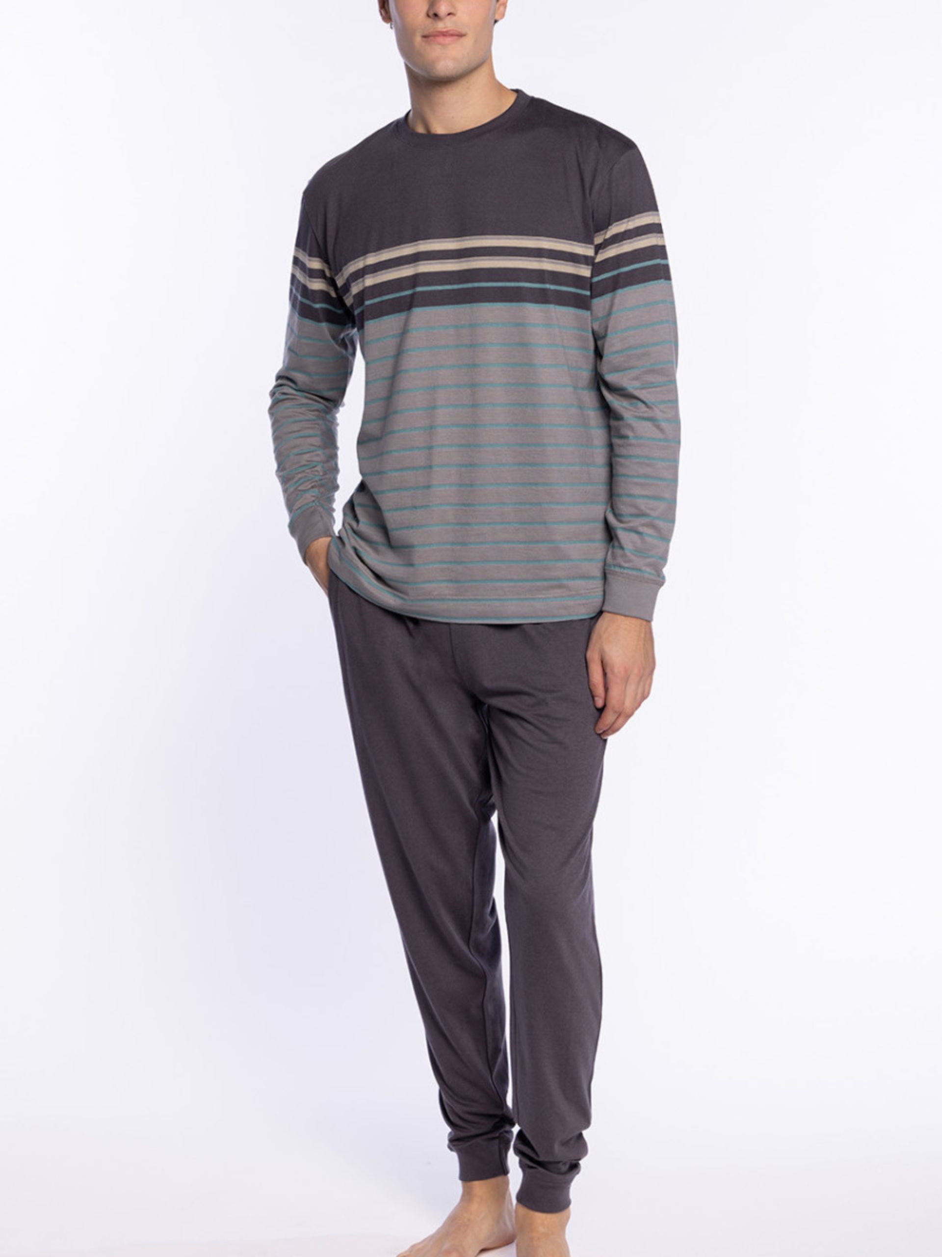 Pijama Bionix confeccionado con bambú. Camiseta mil rayas con tapeta y pantalón gris jaspeado con bolsillos laterales.
