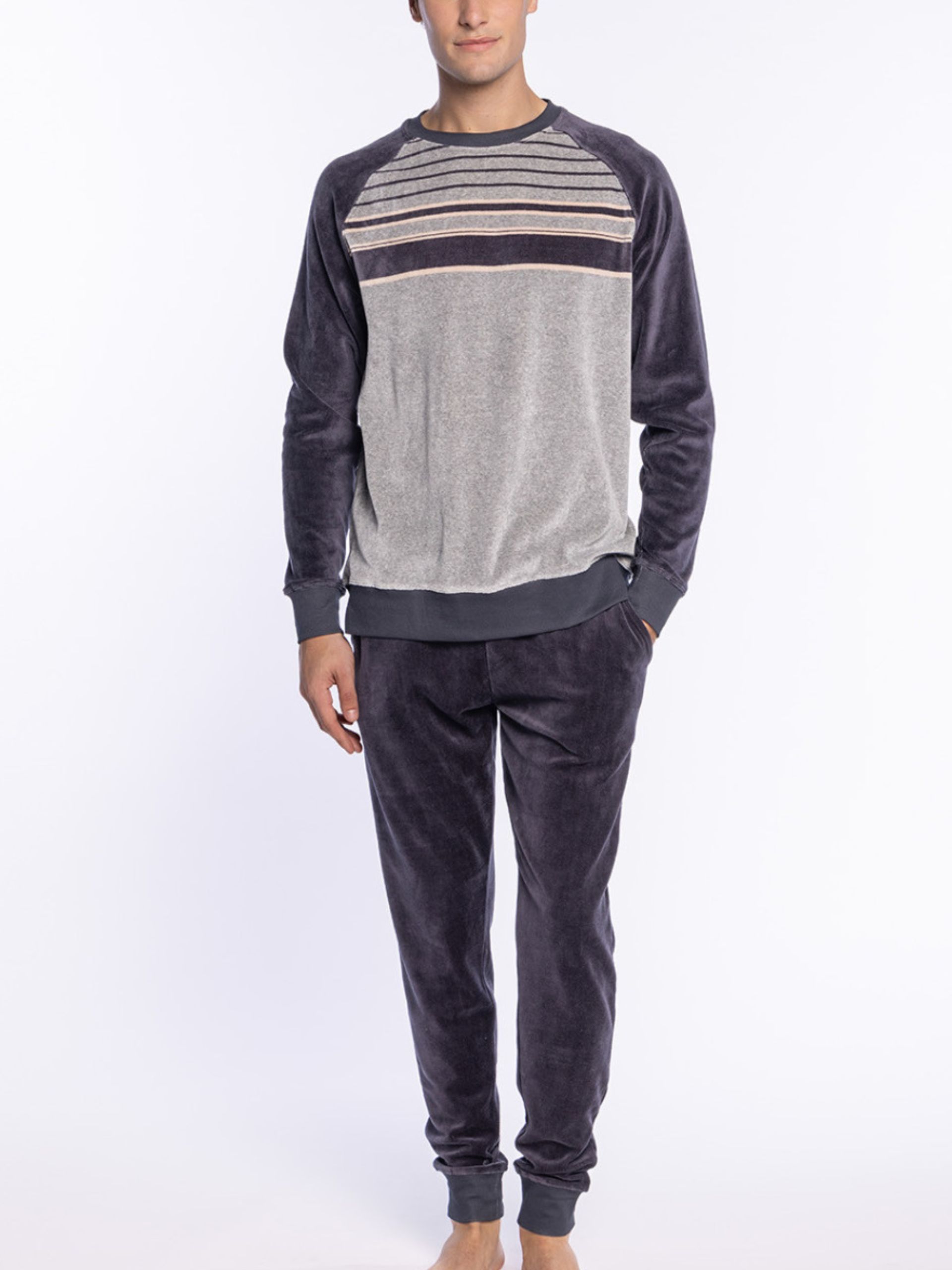 Pijama de terciopelo 100% algodón. Camiseta con estampado rayas en el pecho y pantalón liso con bolsillos y puños.