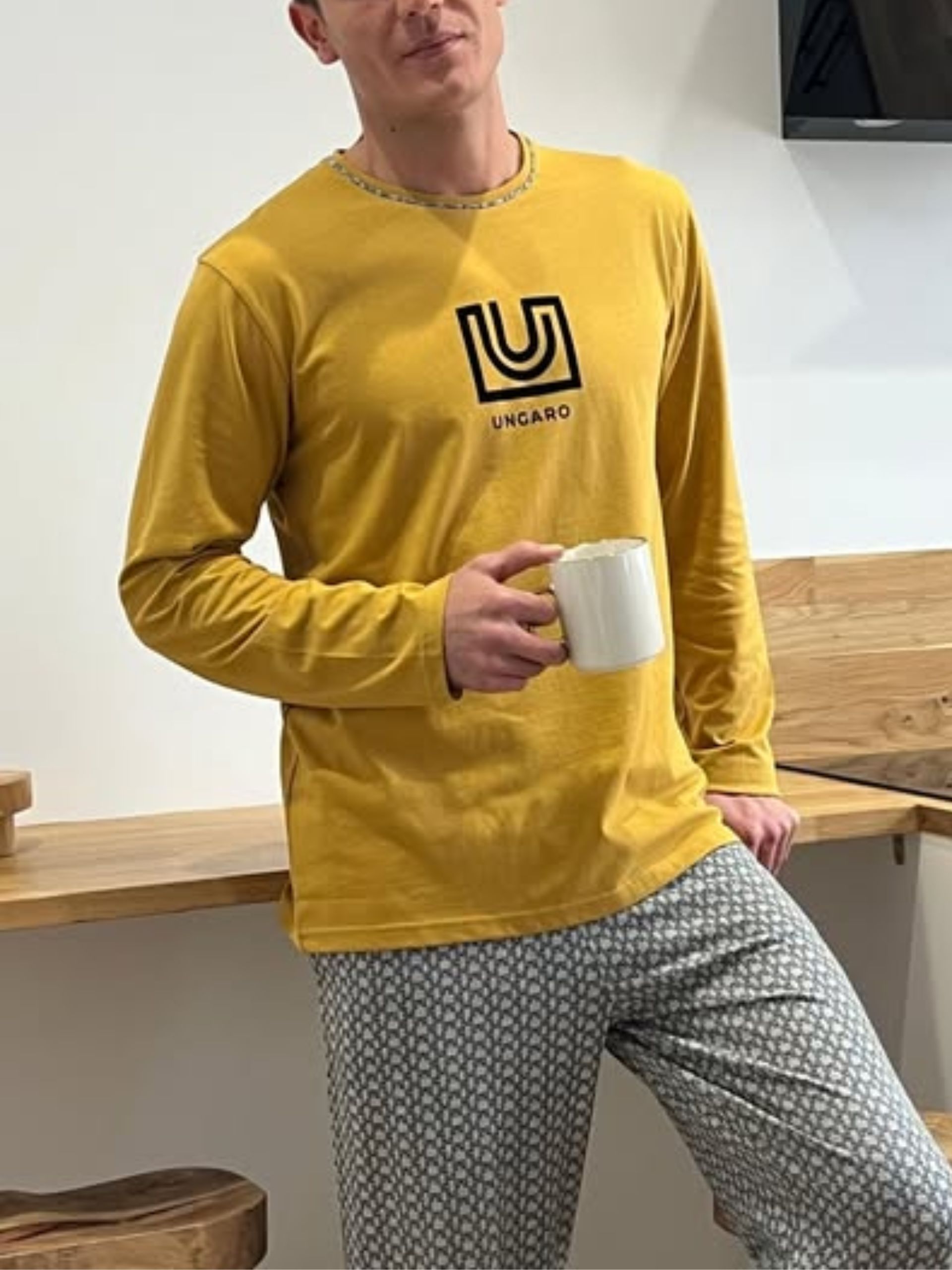Pijama largo de algodón 100%. Camiseta lisa con marca en el centro y pantalón estampado a juego. Mostaza. Suave y ligero.