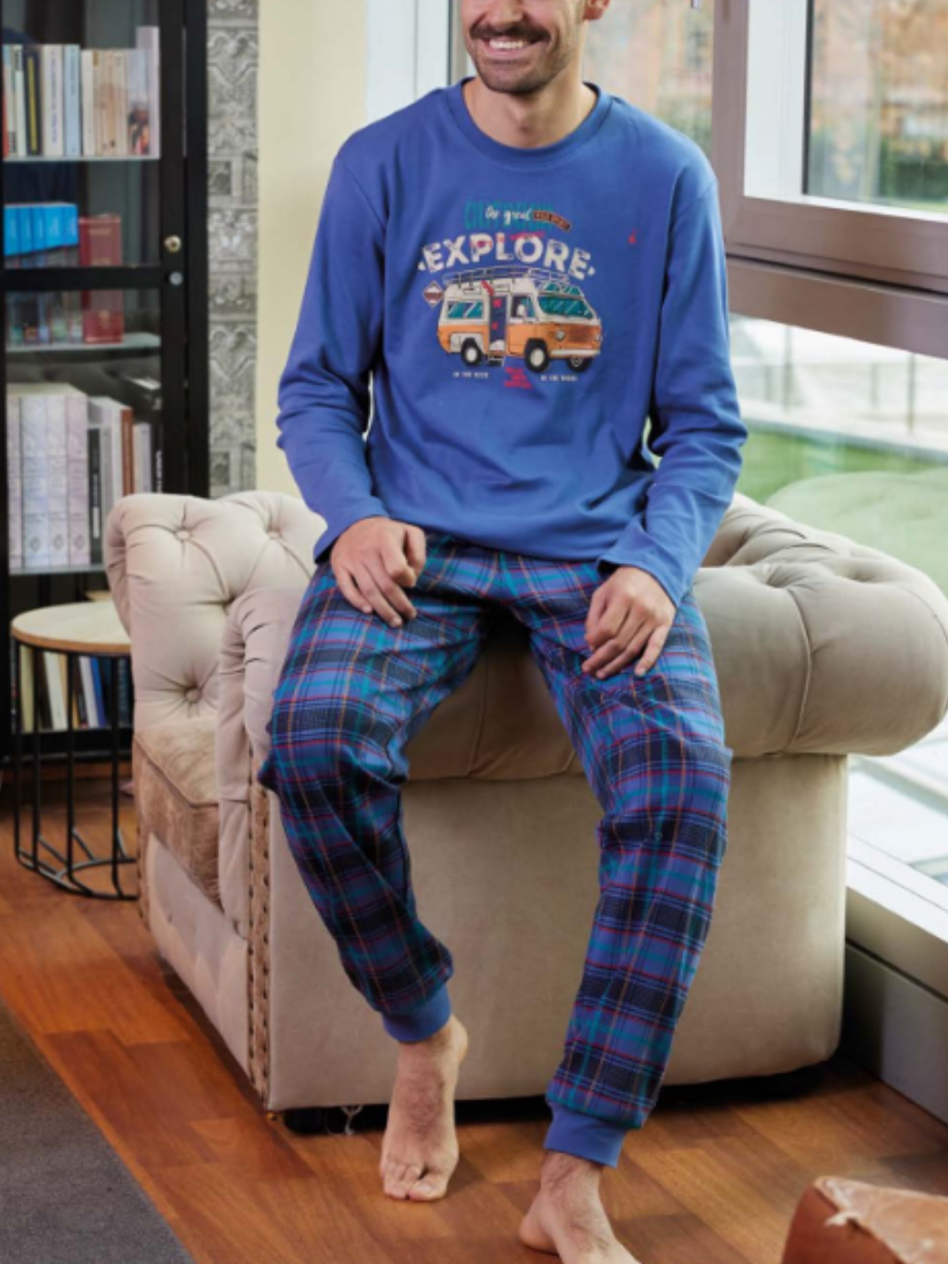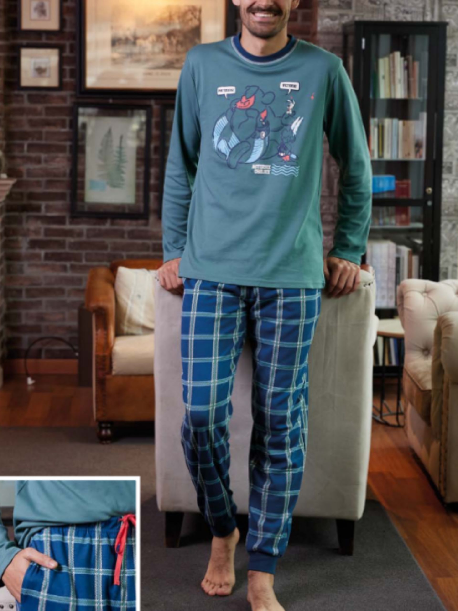 Pijama 60% algodón perchado y 40% poliester. Camiseta azul con dibujo central y pantalón estampado a cuadros con puños.