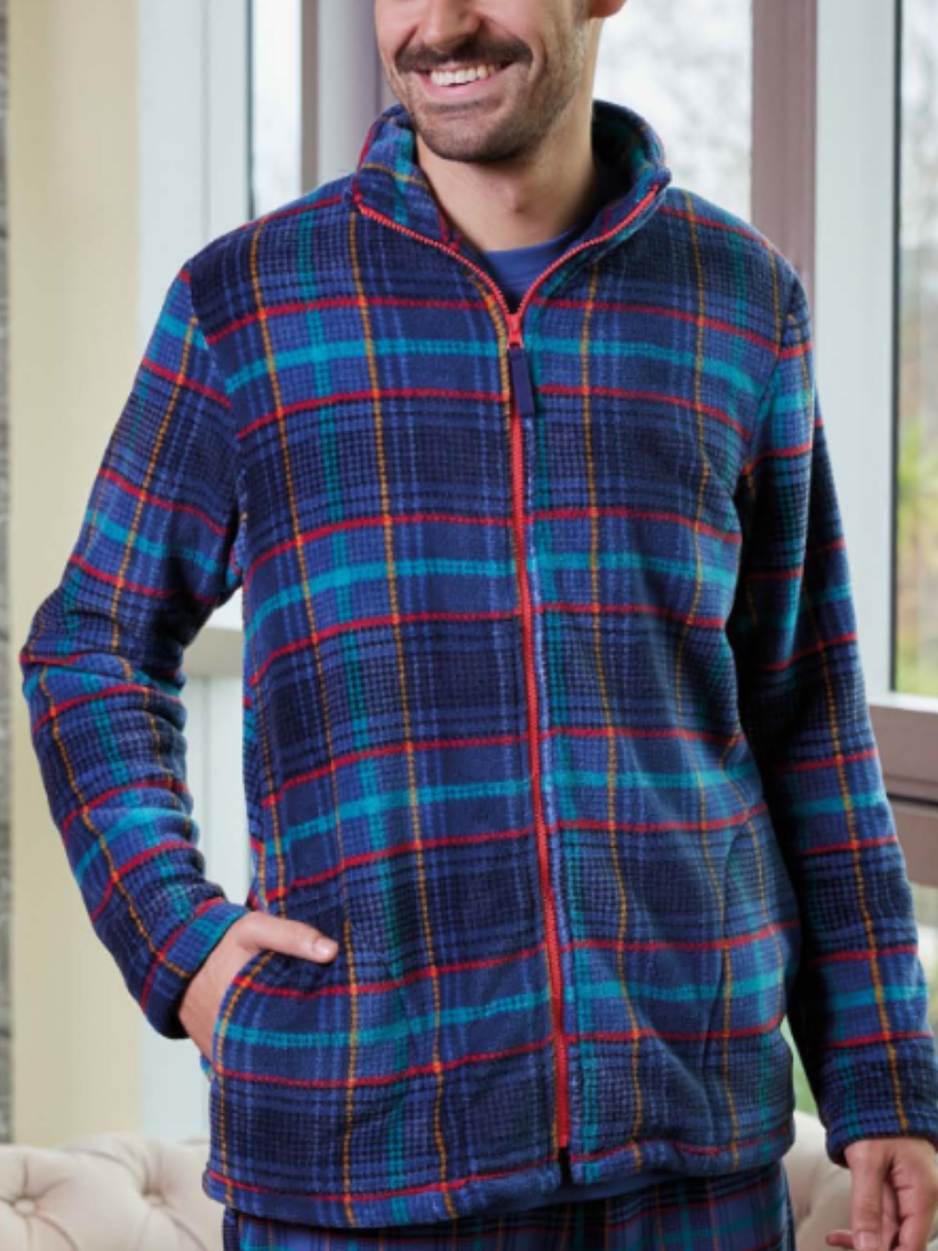 Chaqueta lisa de coralina con cremallera y bolsillos laterales. Detalle de forro estampado a cuadros. Extra suave.