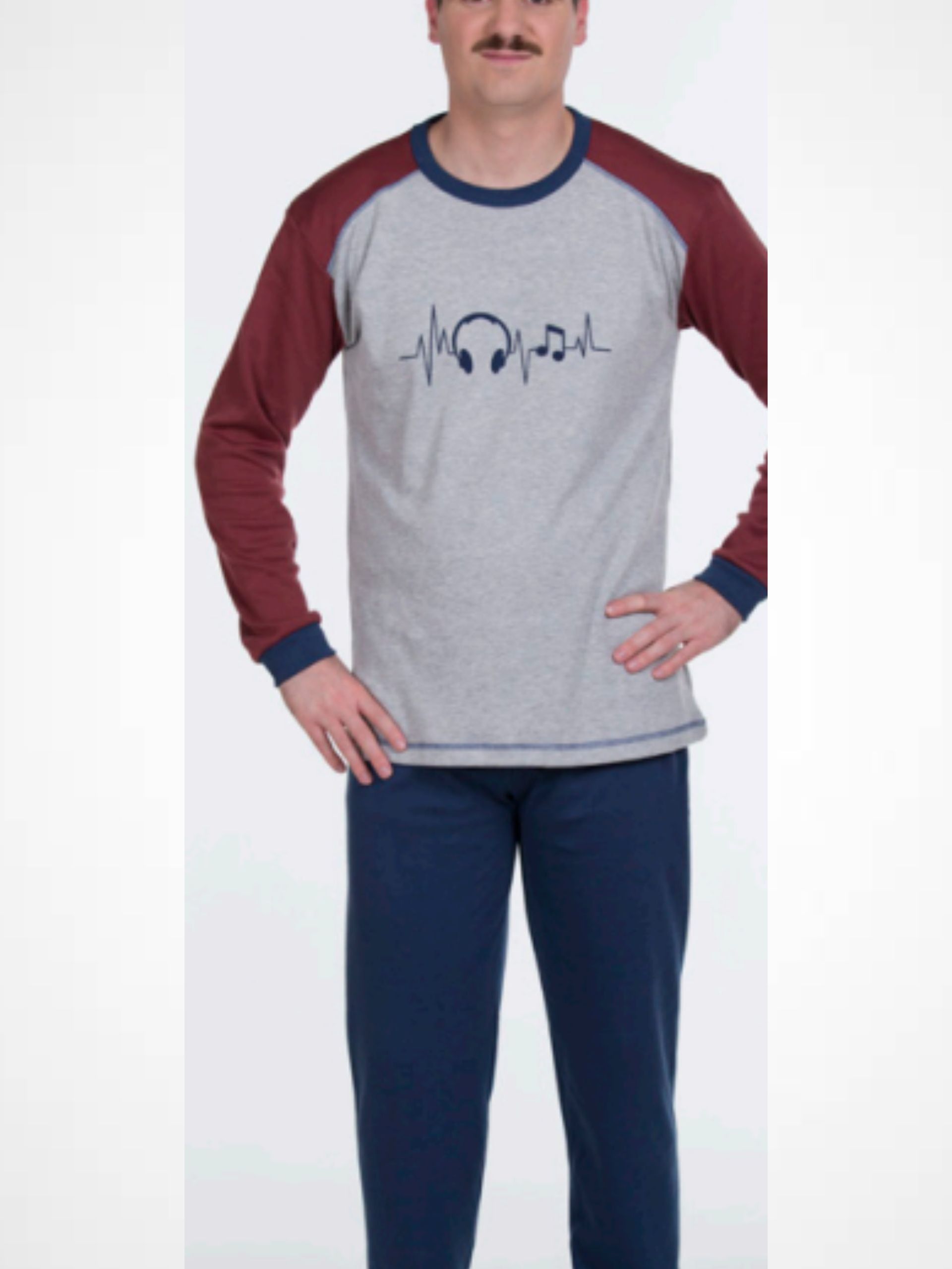 Pijama estampado 50% algodón y 50% poliester. Camiseta cuello redondo y puños con estámpado musical en el centro. Pantalón azul liso a juego.