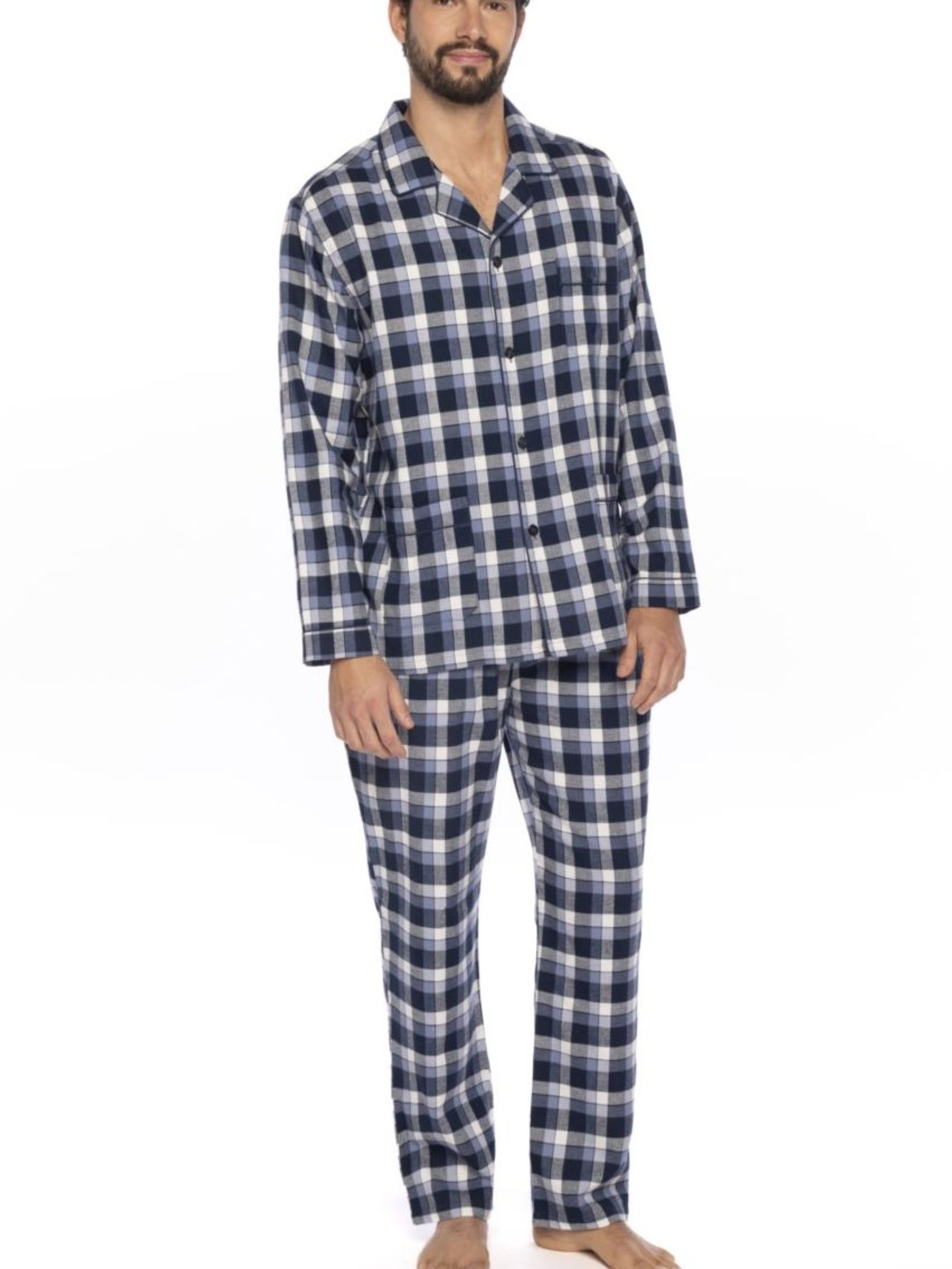 Pijama de vieya estampado a cuadros en tonos azules. Chaqueta abotonada con bolsillos latarales y pantalón con bolsillos. Algodón 100%.