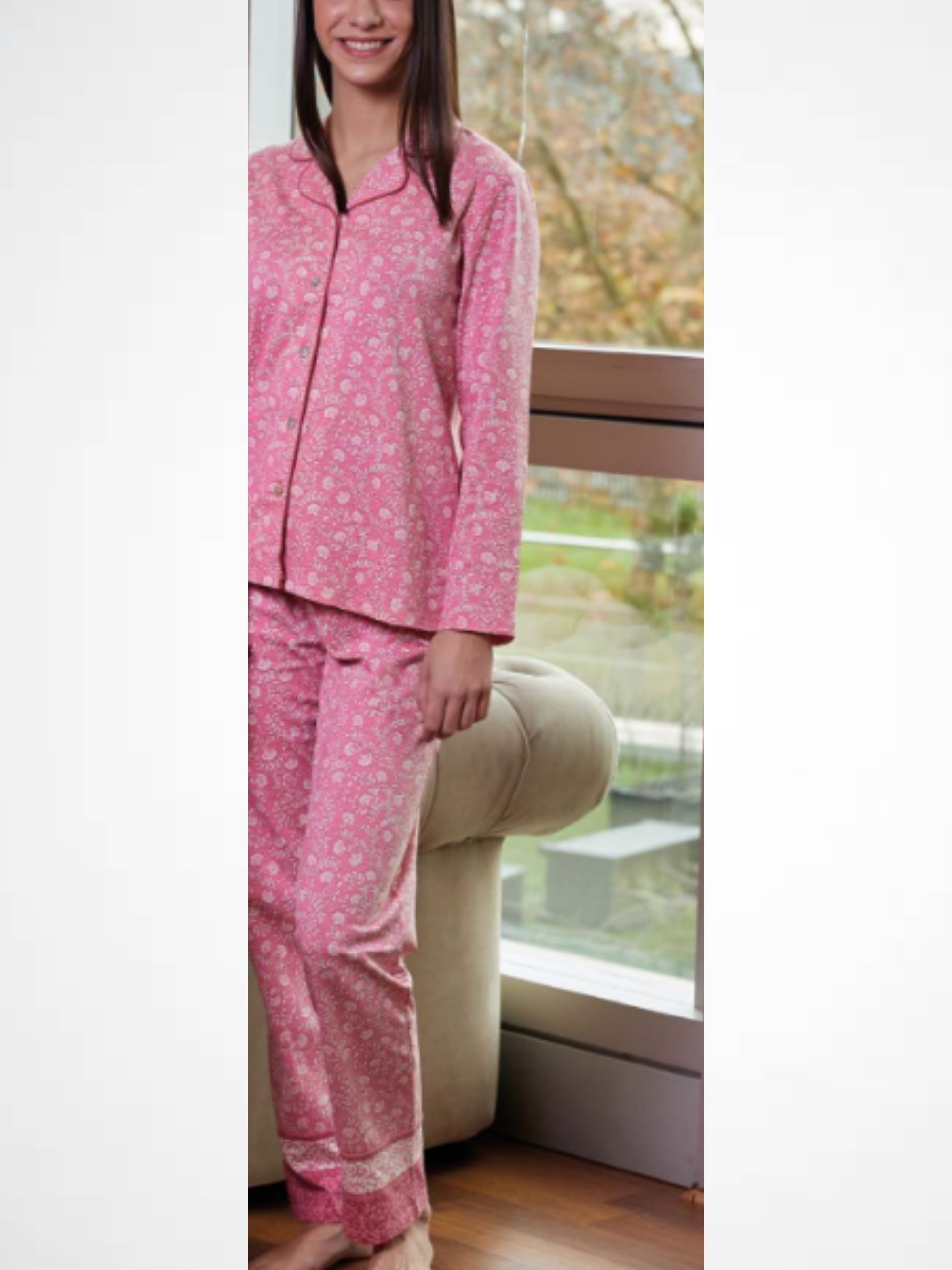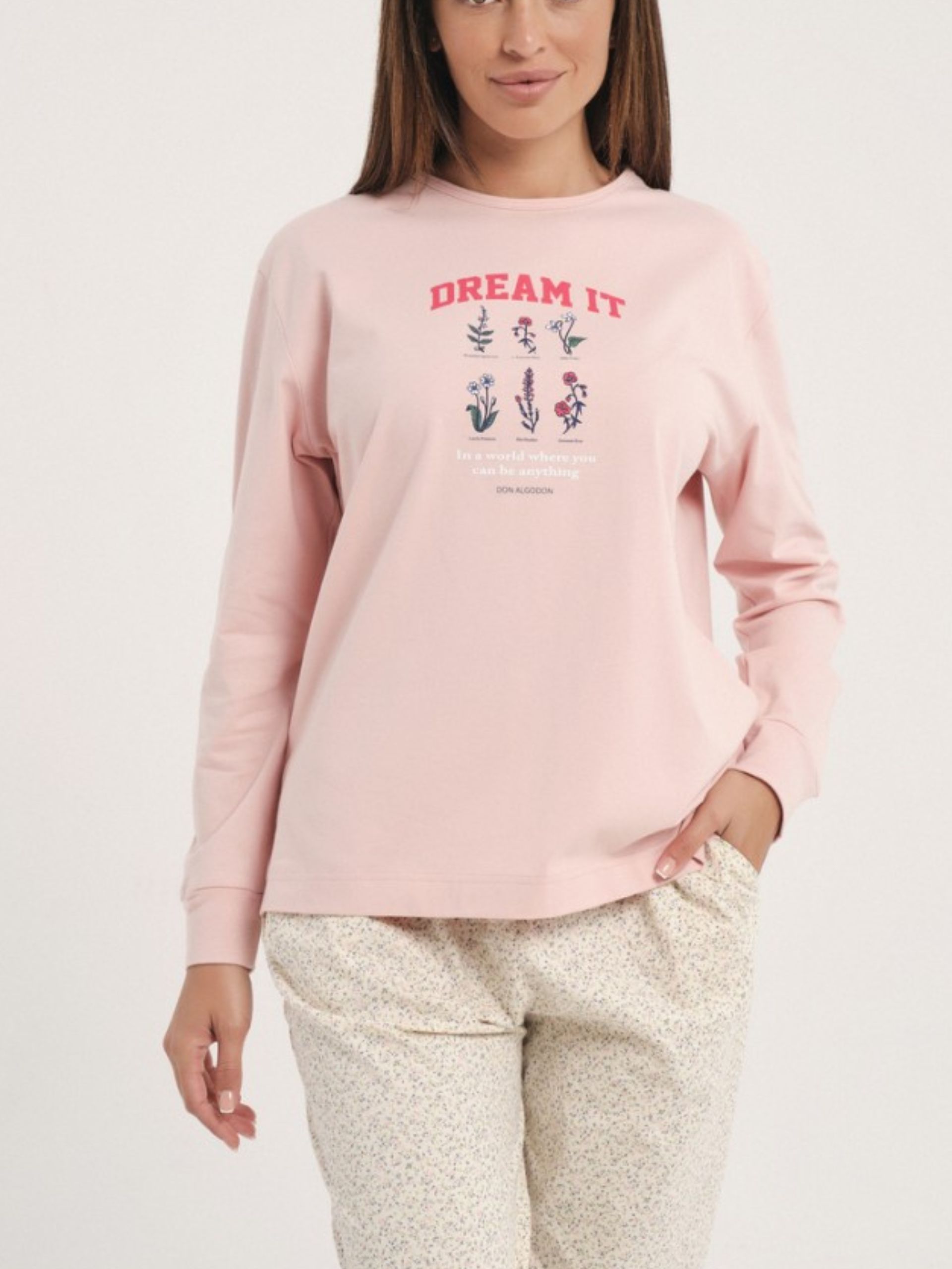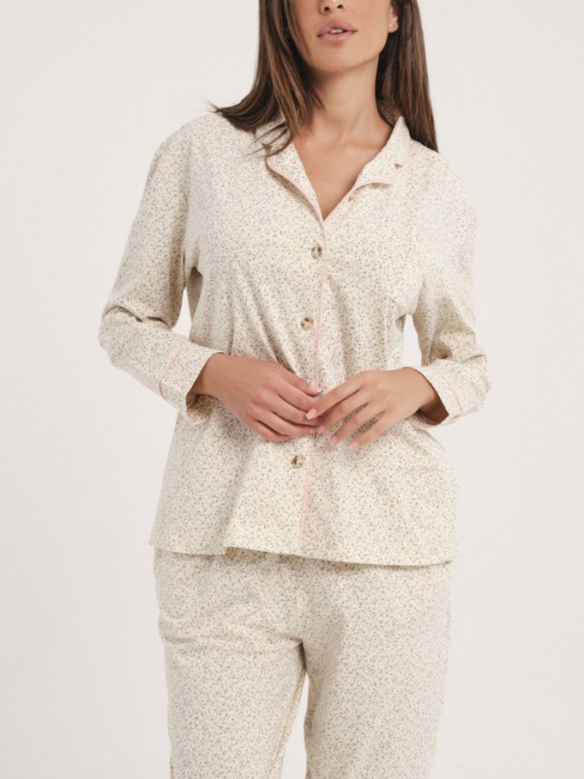 Pijama camiseta marfil con dibujo floral y tapeta. Pantalón liso rosa con puños. 50% algodón.