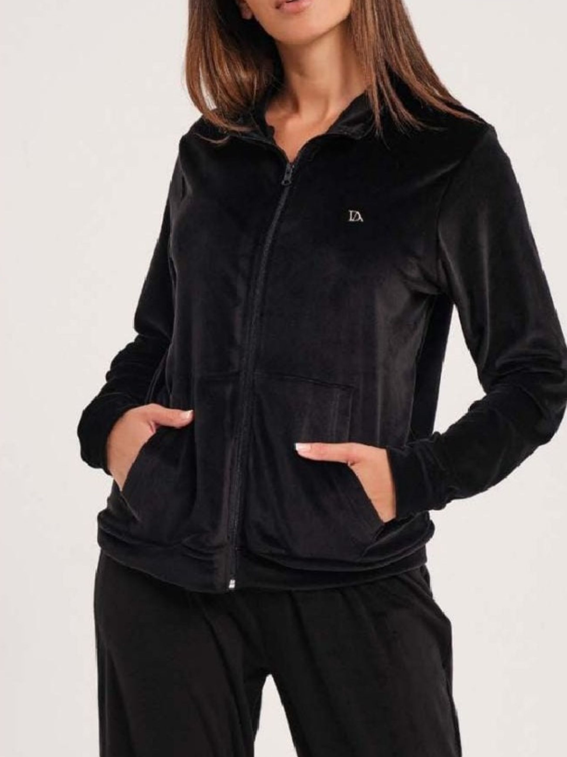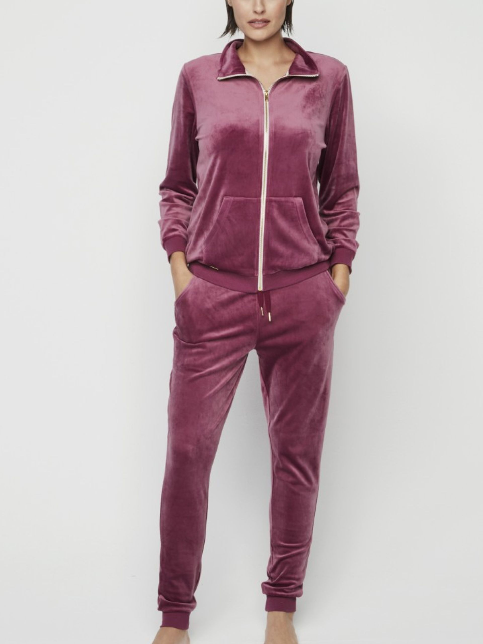 Conjunto sport compuesto por pantalón largo y chaqueta con bolsillos y cremallera. Tejido extra suave.