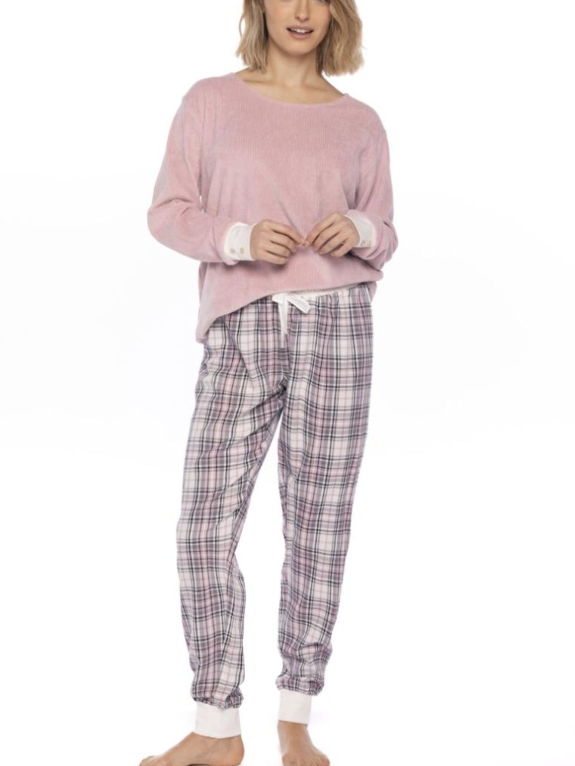 Pijama algodón camiseta lisa velour con puños y pantalón viella cuadros con tonos a juego, goma, lazada en la cintura y puños.