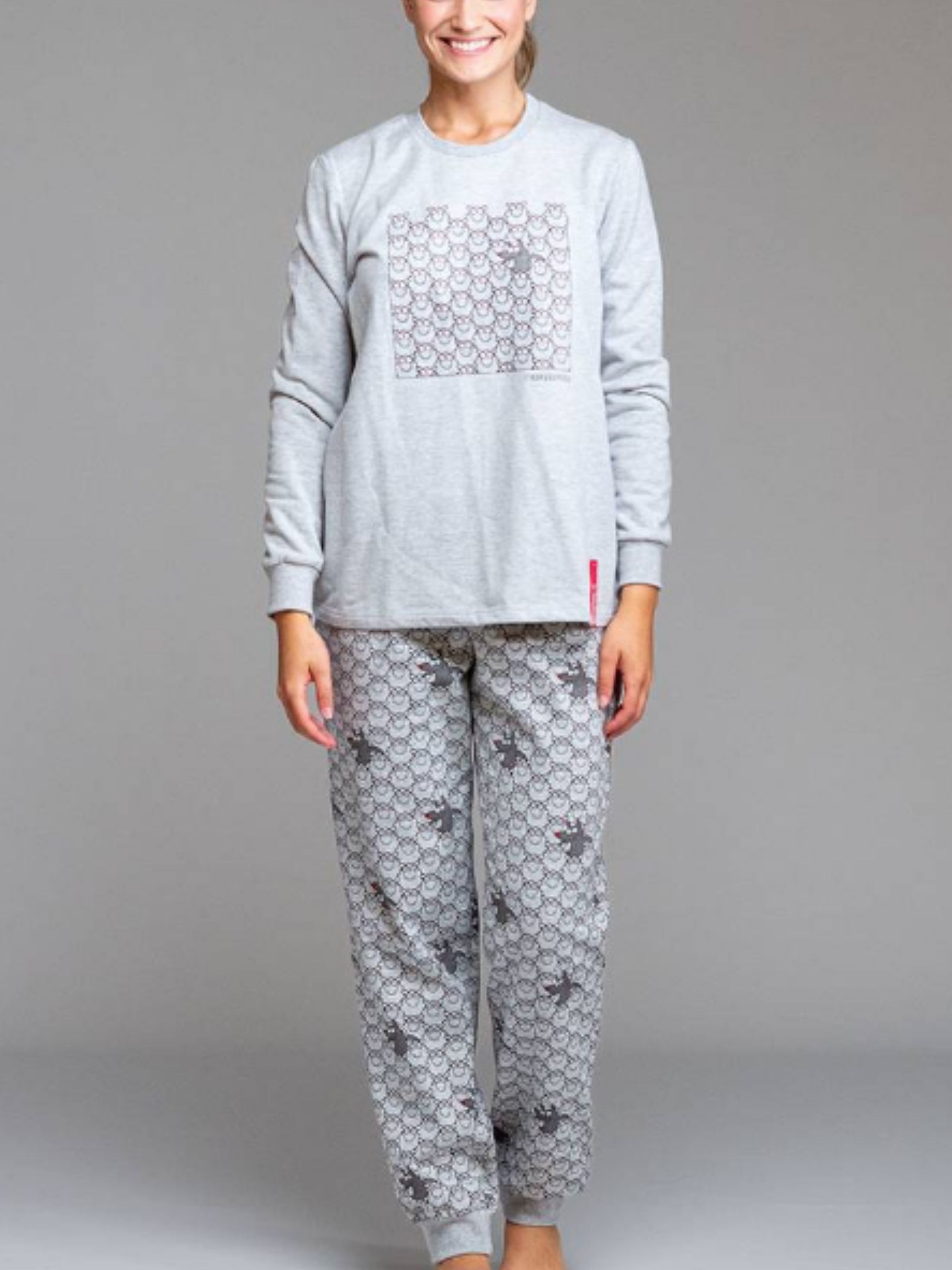 Pijama gris con camiseta cuello redondo y puños y estampado rebaño en centro y pantalón estampado a juego con puños.