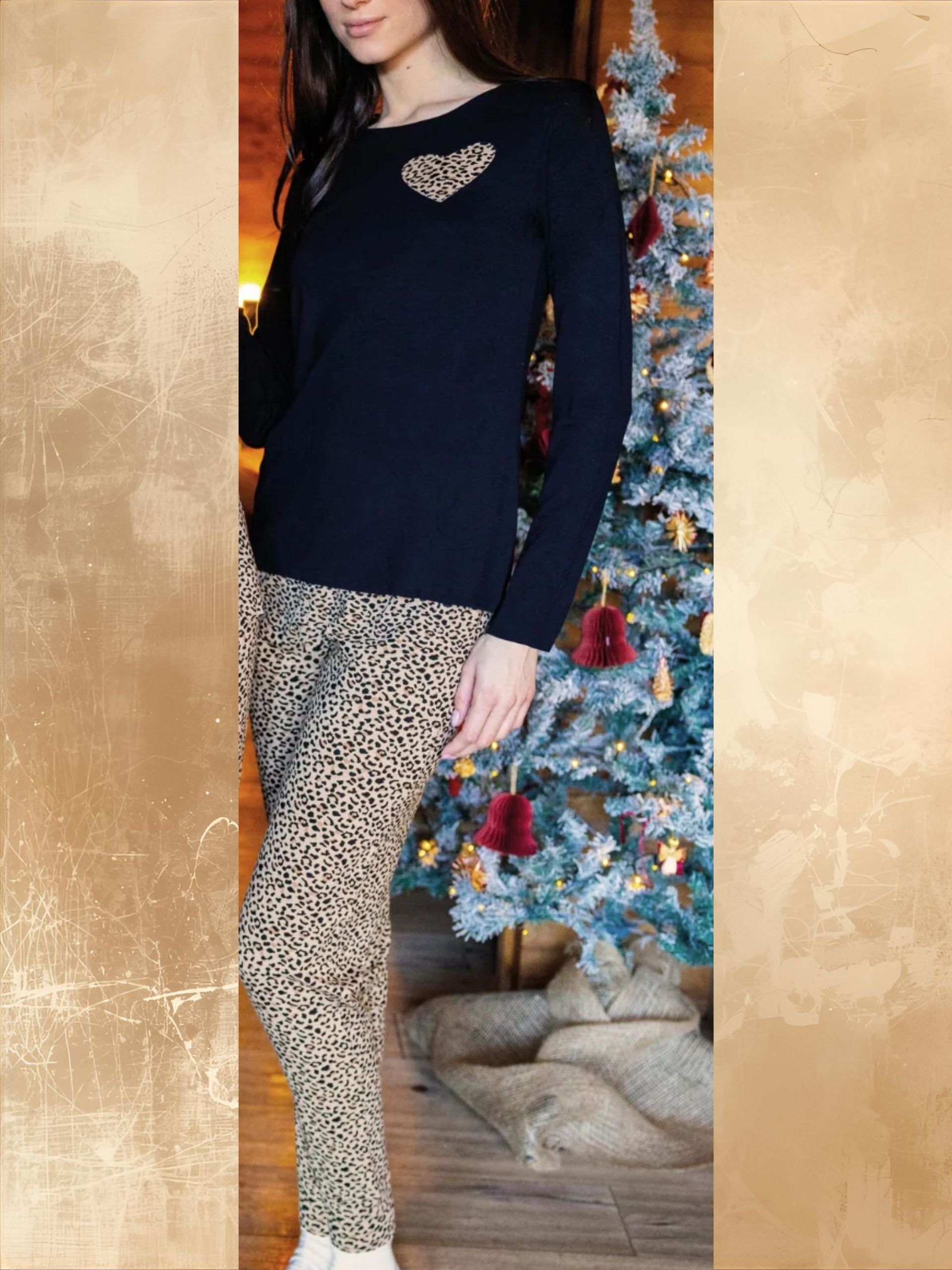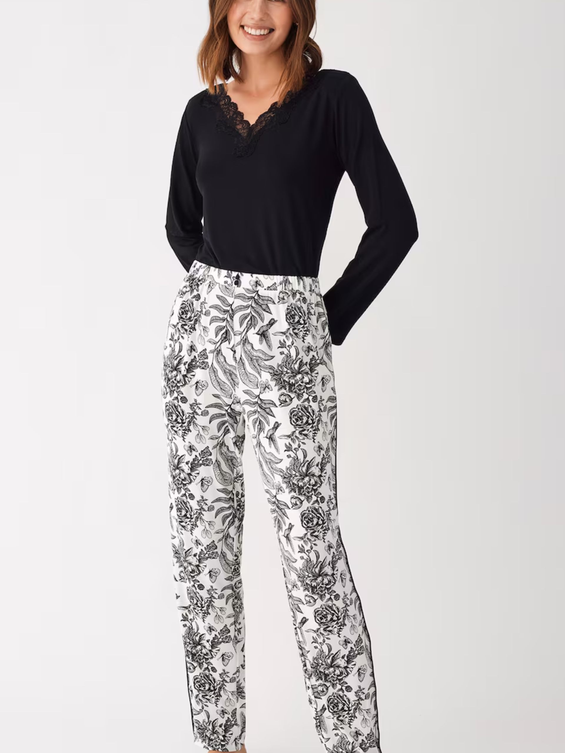 Pijama viscosa con camiseta negra cuello en V con encaje y pantalón estampado a juego con vivo en los laterales.