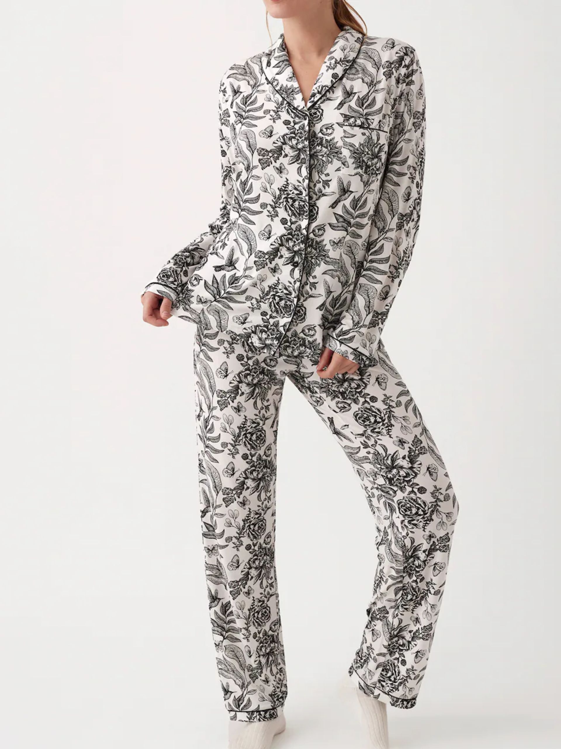 Pijama estampado geométrico camiseta cuello redondo y pantalón con lazo en la cintura. 50% algodón y 50% modal.