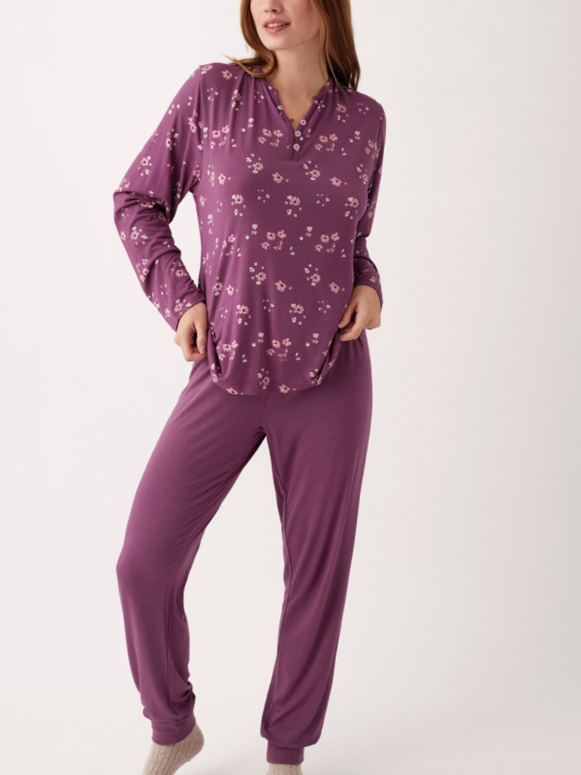 Pijama camiseta con estampado floral y pantalón liso con puño. Suave tejido de viscosa. Color burgundy.