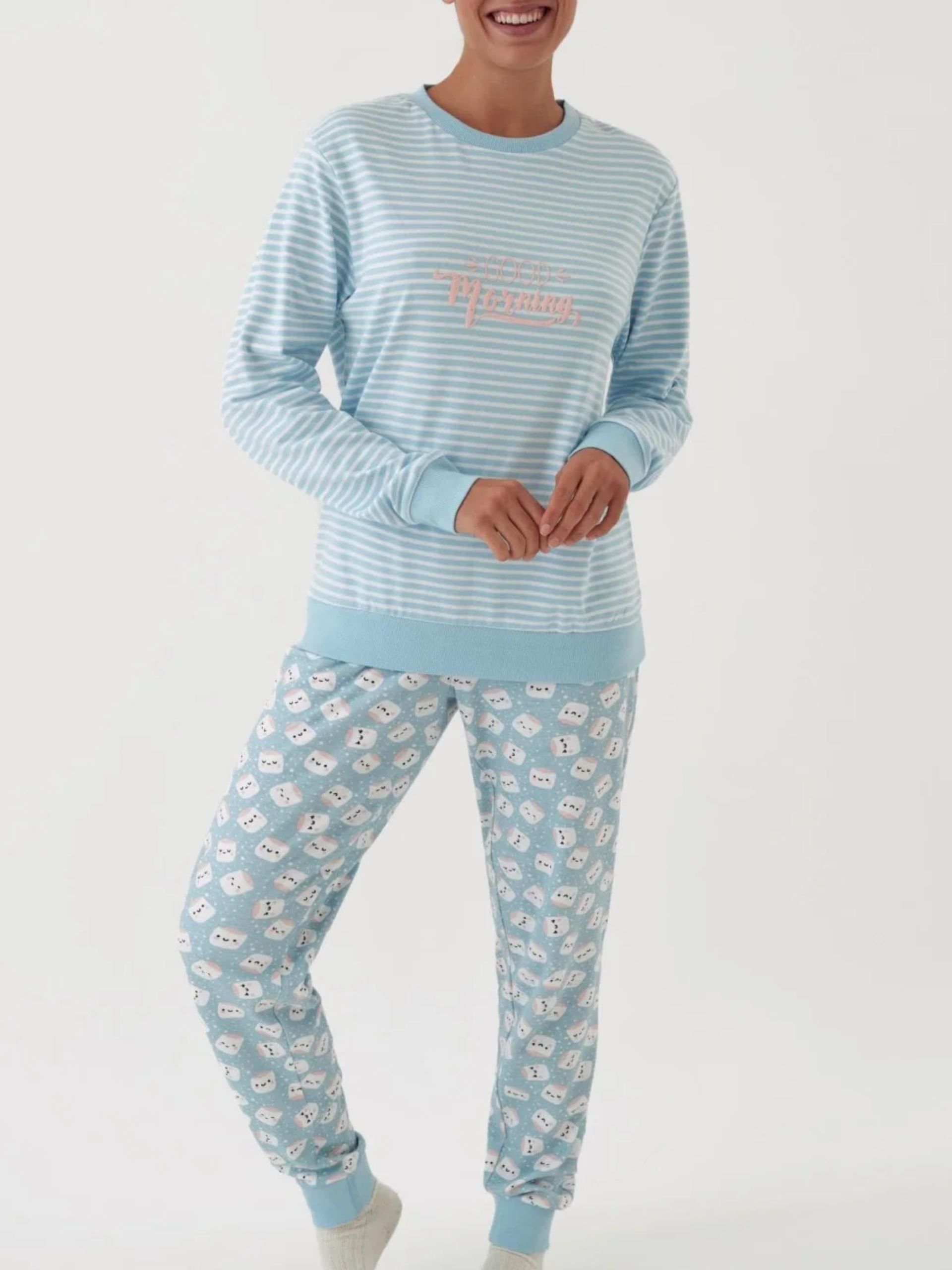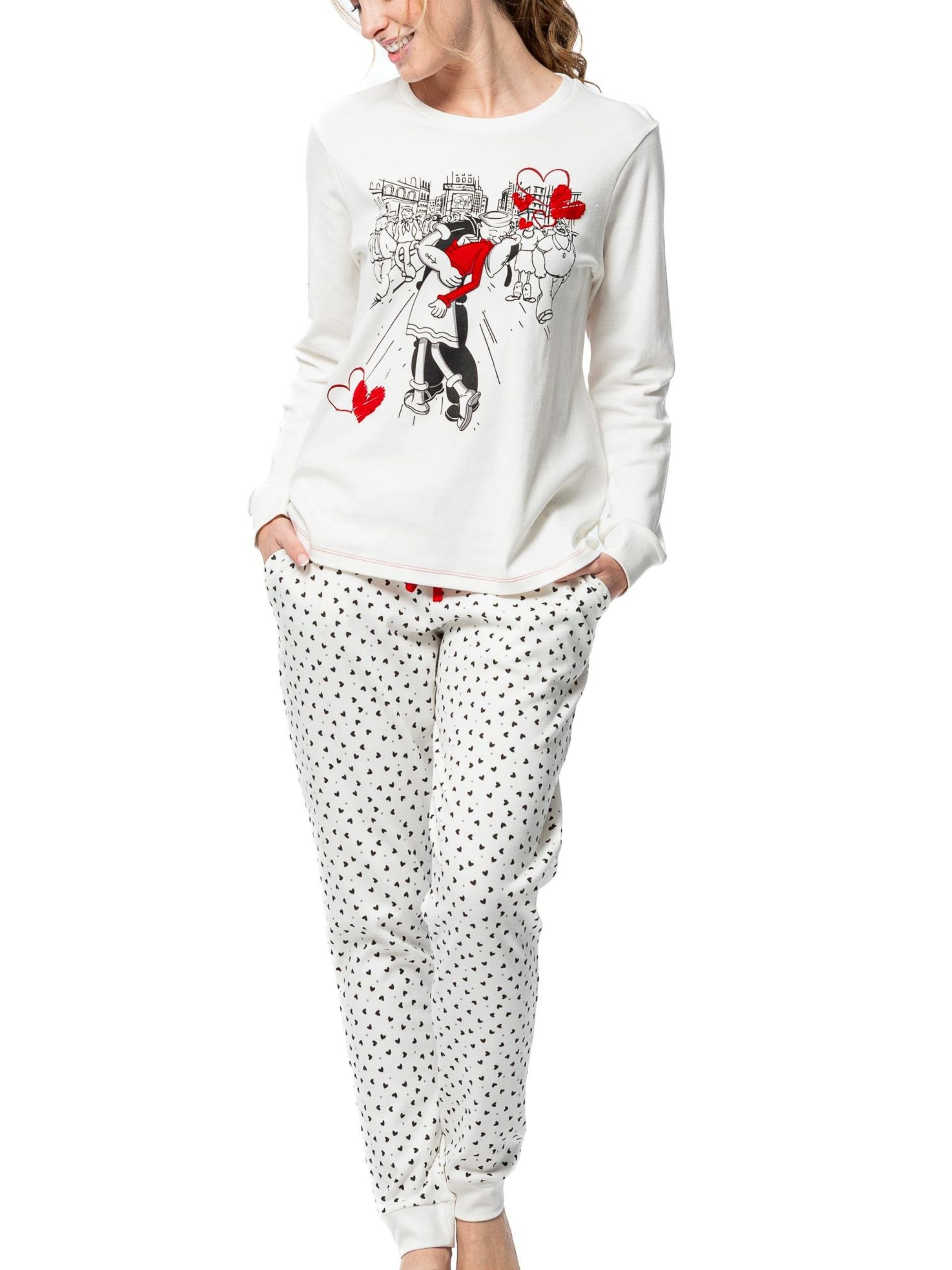 Pijama confeccionado en interlock de algodón 100%. Camiseta blanco crudo con estampado frontal y pantalón estampado con puños y bolsillos.
