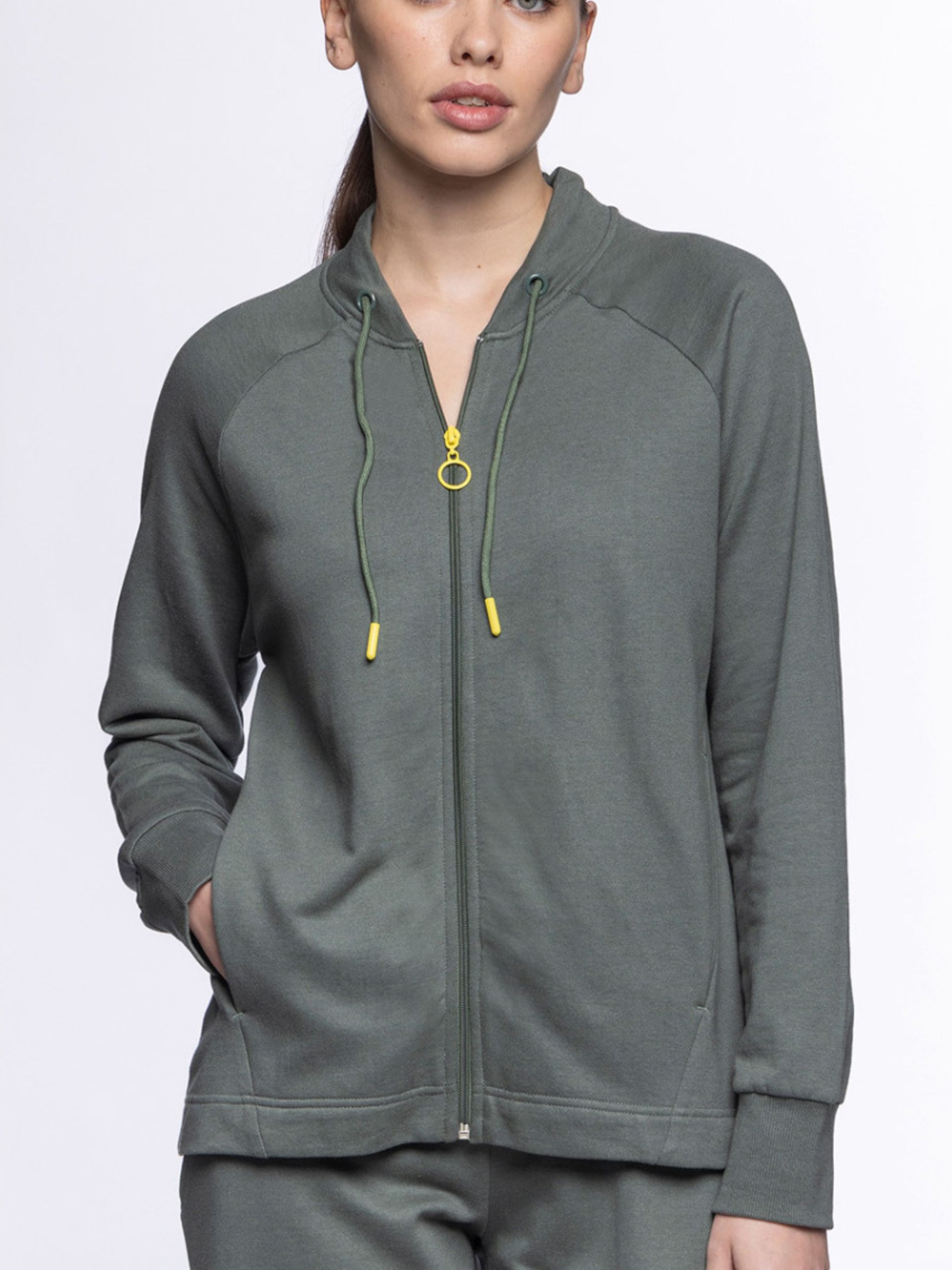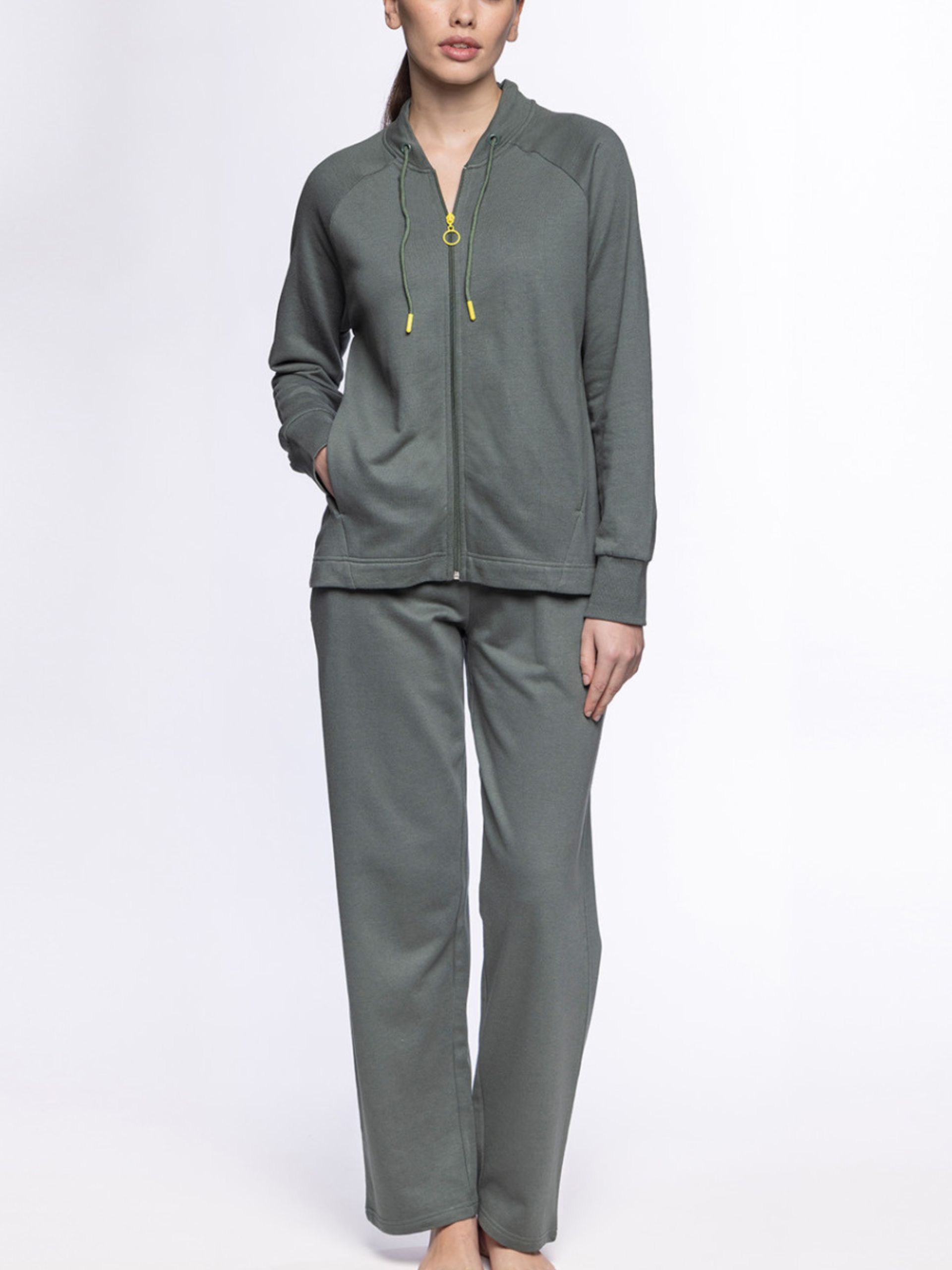 Conjunto bata corta de sedalina con cremallera y camiseta lisa viscosa verde a juego con pantalón estampado con puños.