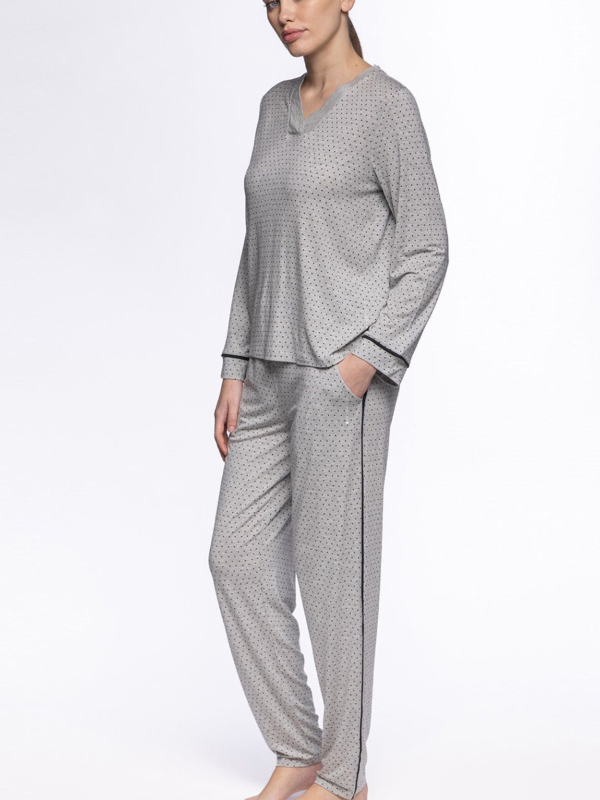 Pijama estampado de lunares. Camiseta cuello pico y pantalón recto con bolsillos. Tejido modal elástico muy confortable.