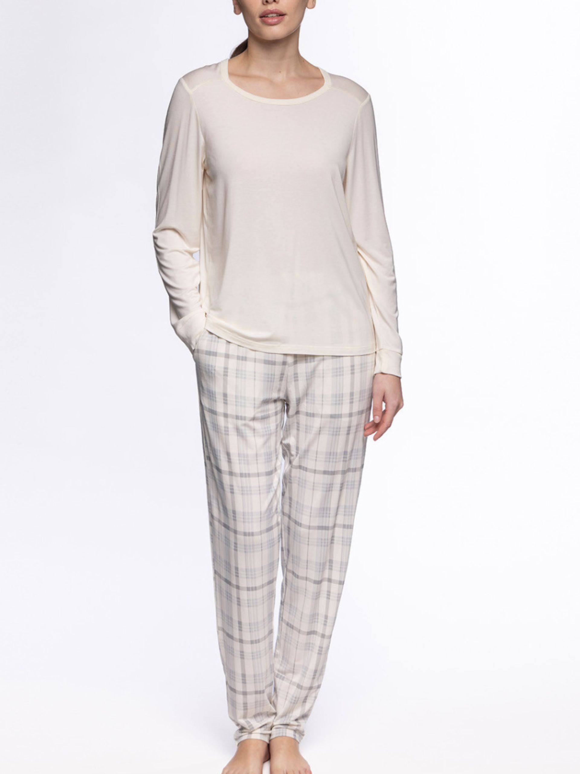 Pijama de modal elástico. Camiseta cuello redondo y pantalón de cuadros estampados con bolsillos. Colores neutros.