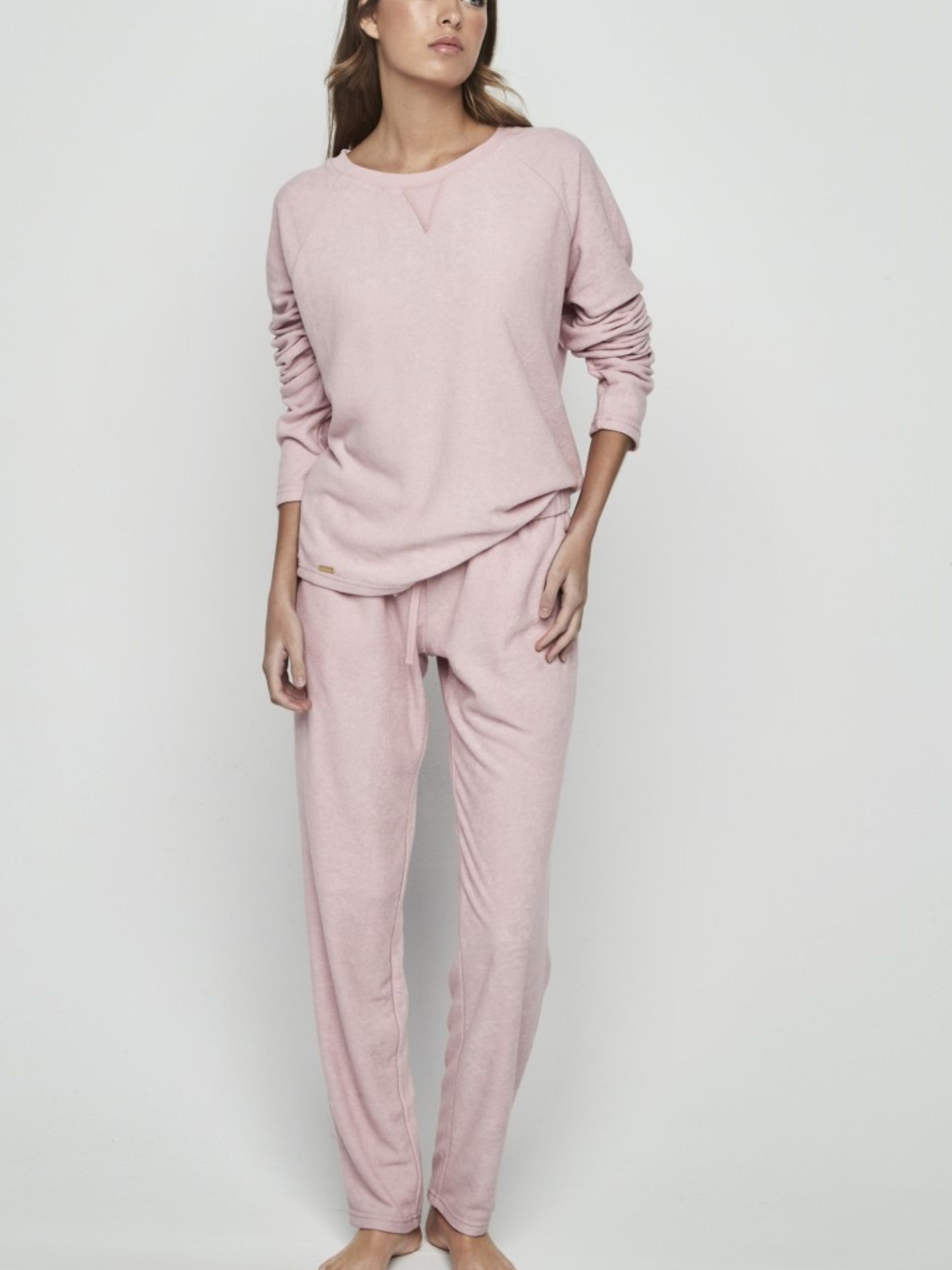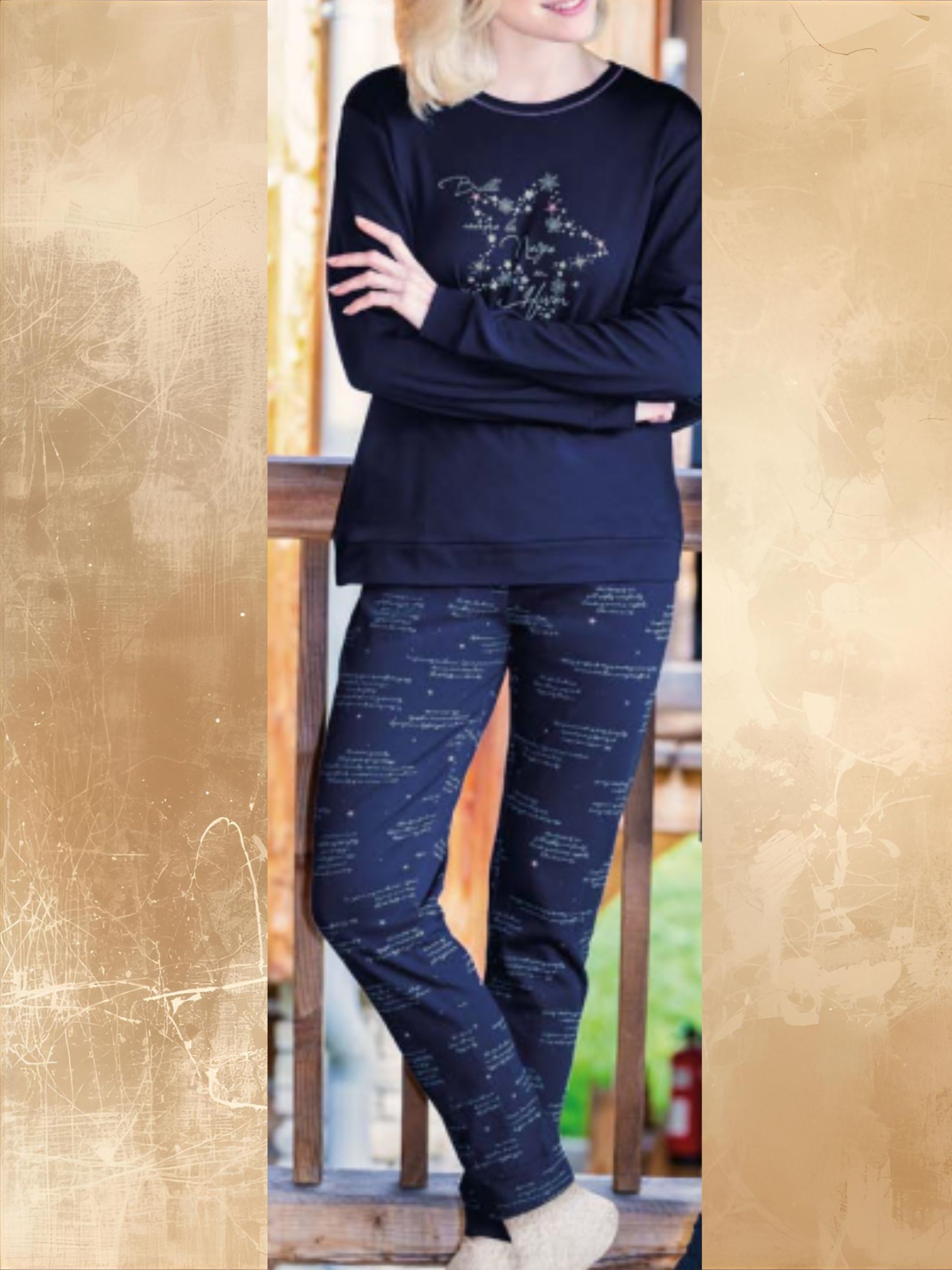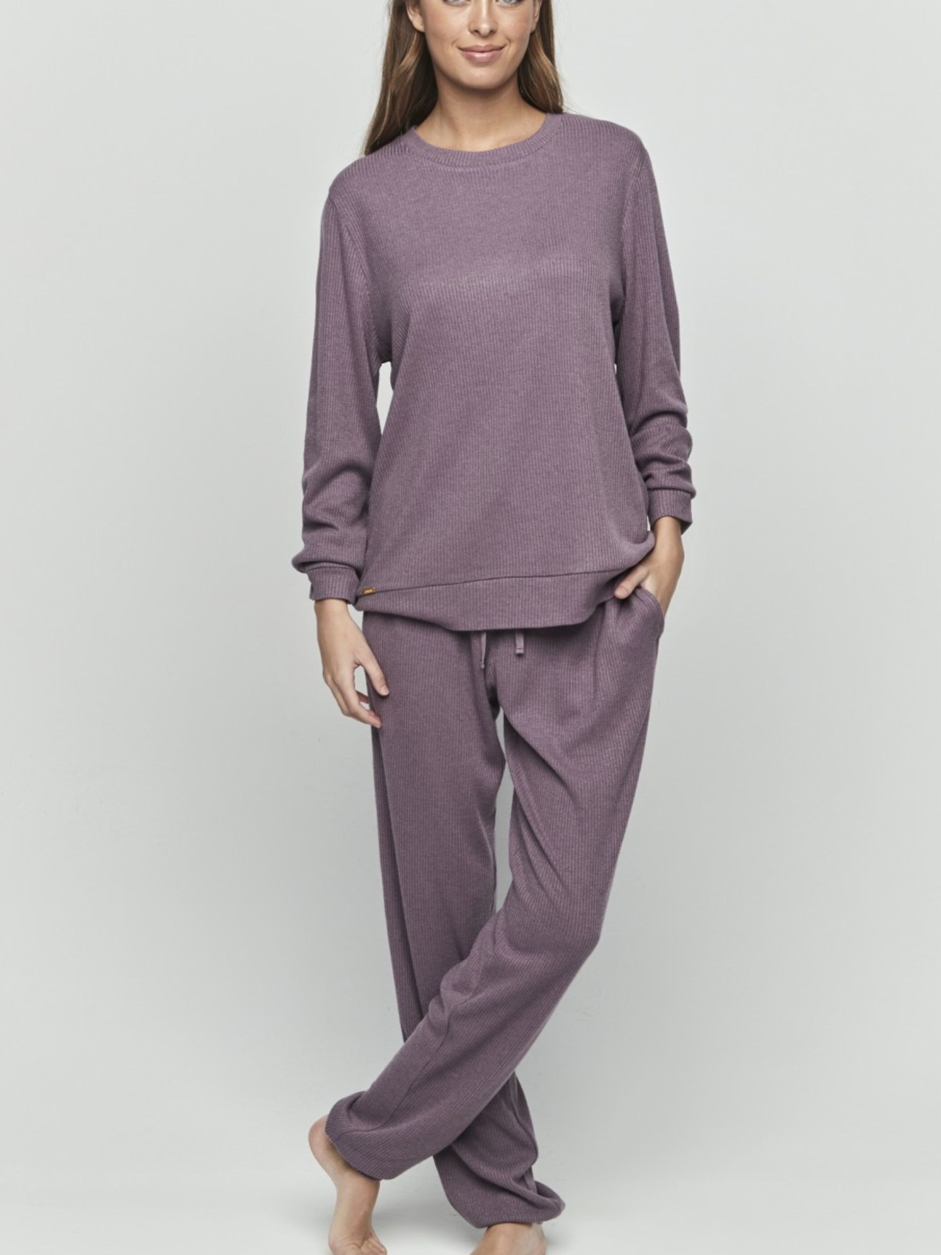 Pijama de mujer dos piezas. Tejido extra suave. Camiseta manga larga cuello redondo y pantalón largo con bolsillos y lazo ajustable.
