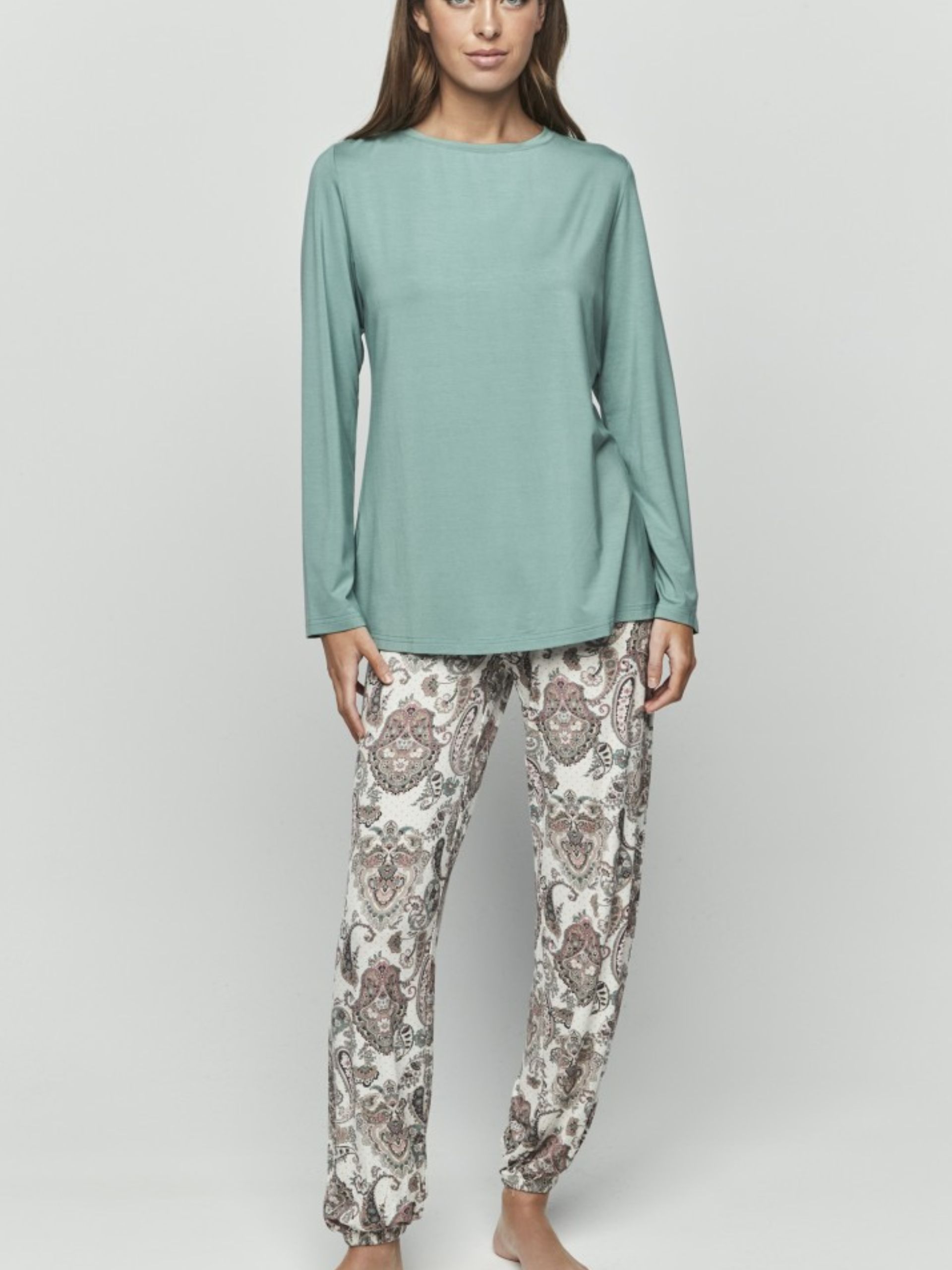 Pijama de mujer de dos piezas. Camiseta lisa manga larga cuello redondo y pantalón largo con puño estampado cachemir.