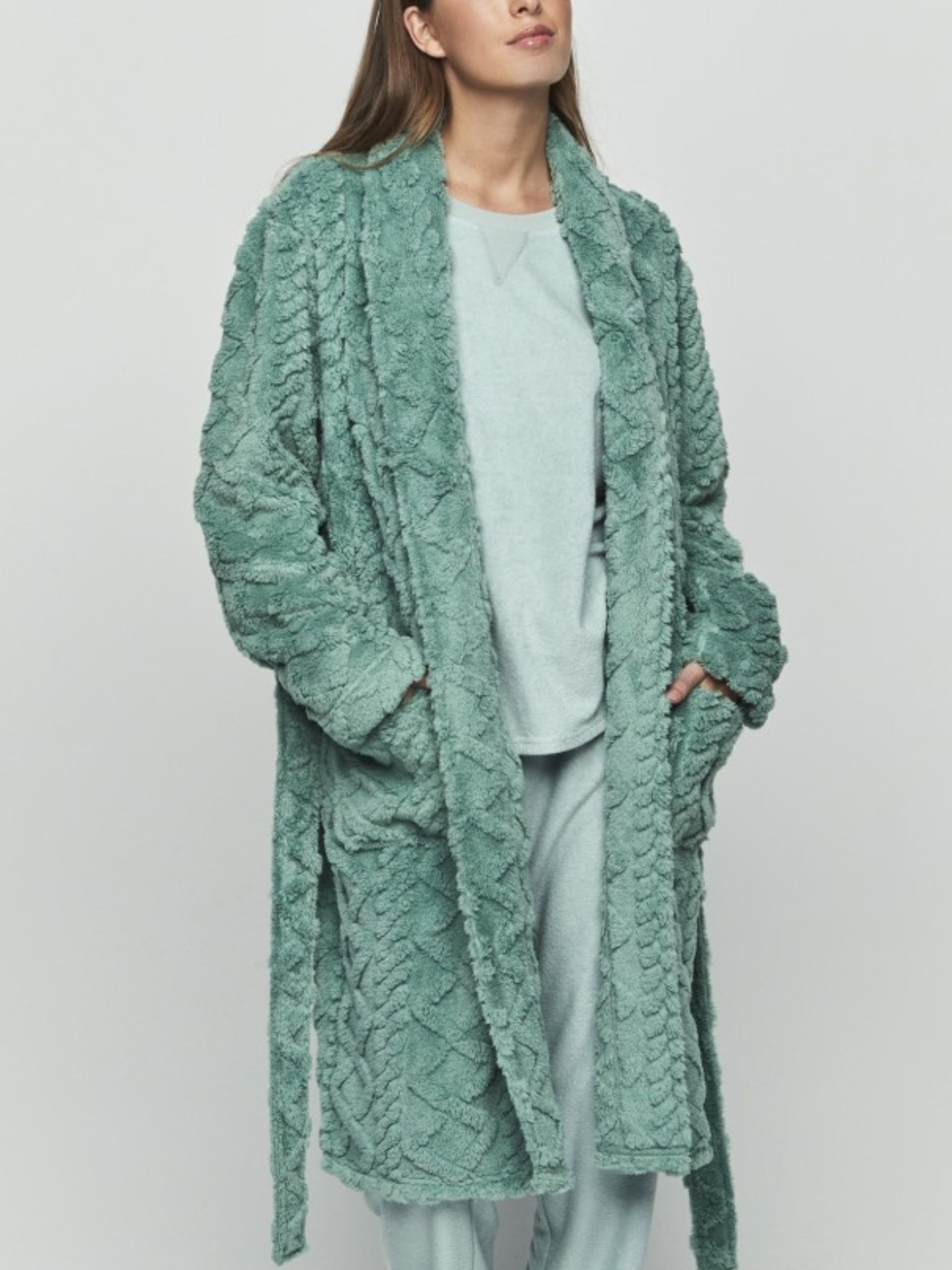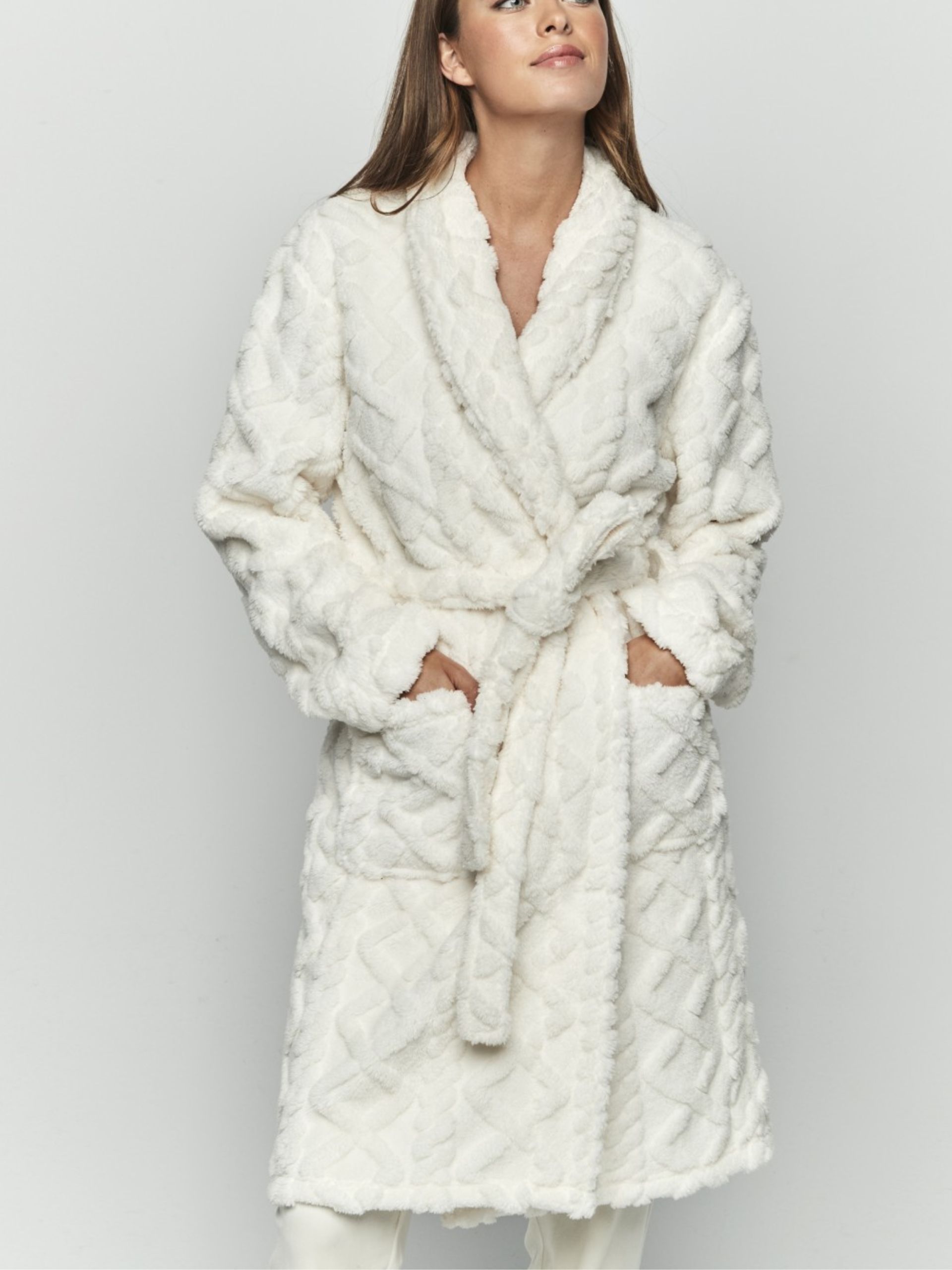 Bata larga jacquard. Cruzada con lazo para anudar, cuello smoking y bolsillos frontales. Suave y cálida. Colores: verde y marfil.