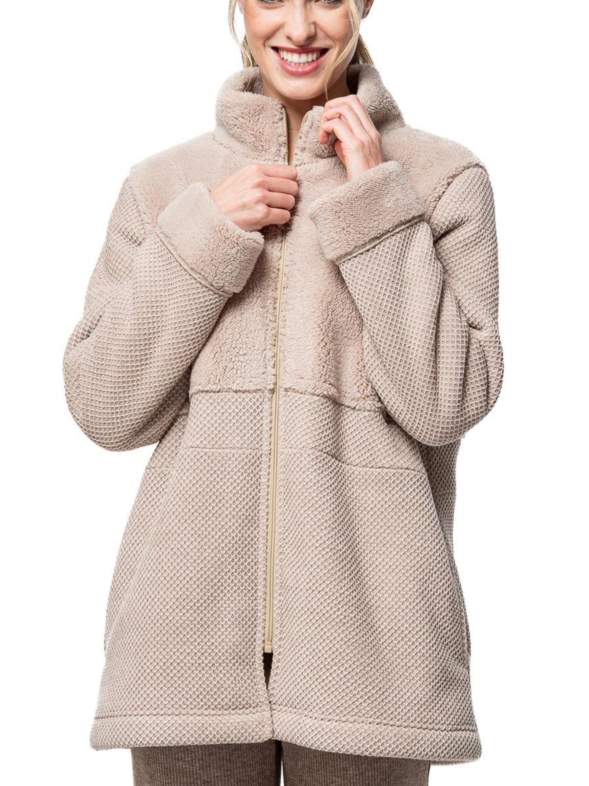 Bata cálida combina tejido chenilla con borreguito en puños y cuello. Cierre frontal con cremallera y bolsillos. Corte cómodo. Color marrón.