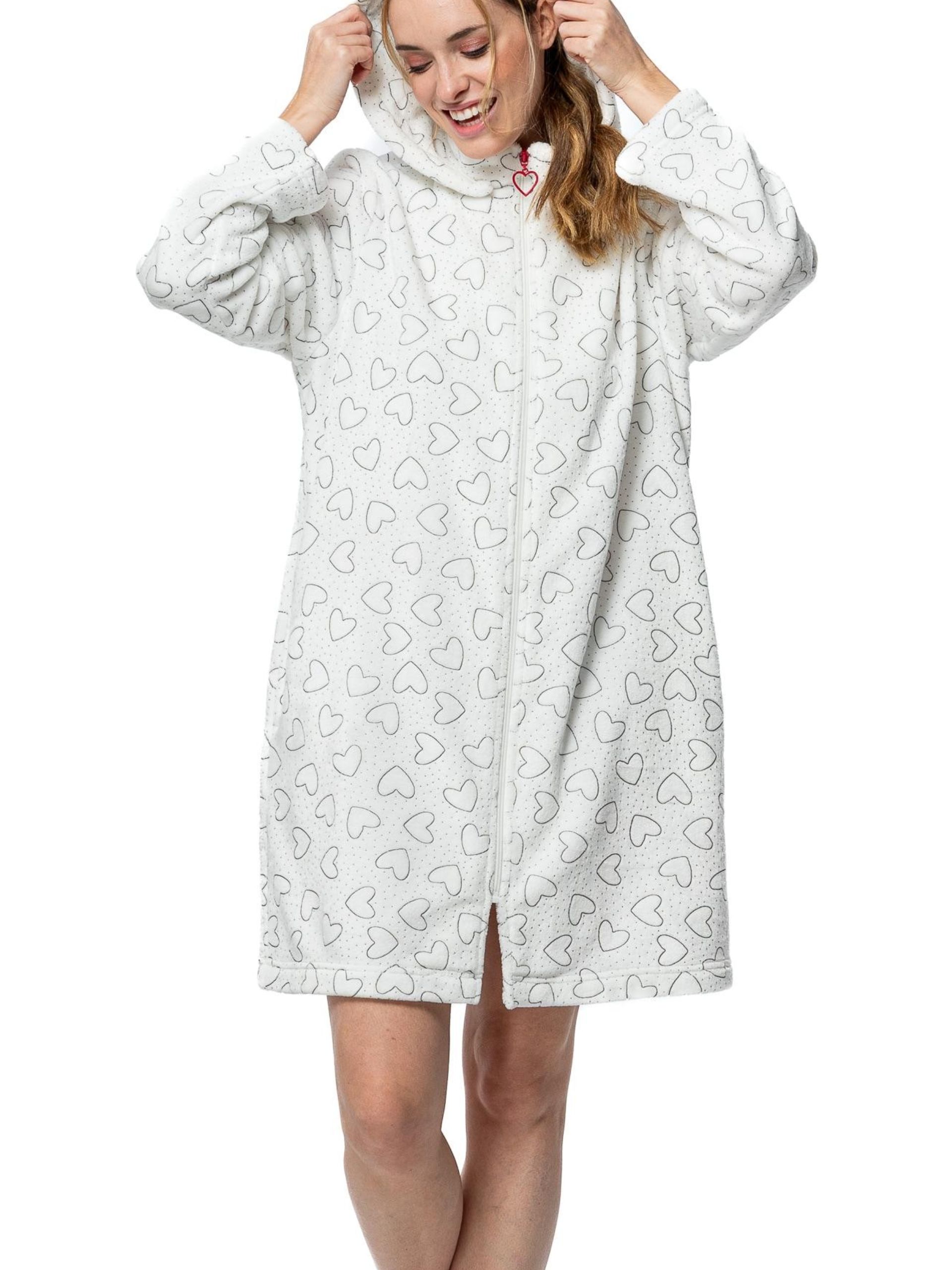 Conjunto pijama interlock de algodón 100%. Blanco crudo estampado corazones y bata cálida y ultra suave con capucha y cierre con cremallera.
