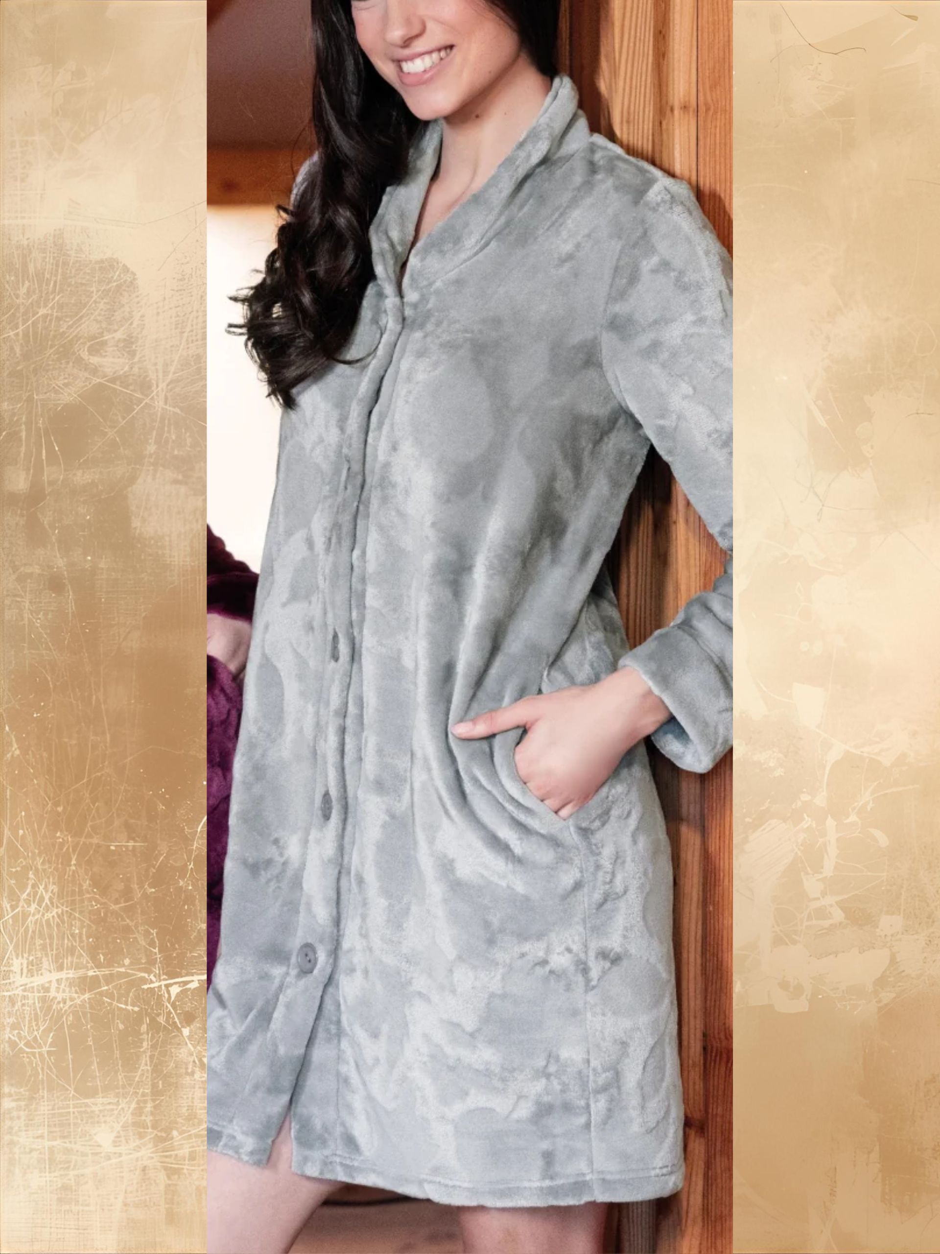 Bata larga cálida azul cielo, con rombos en relieve. Abotonada, con bolsillos.