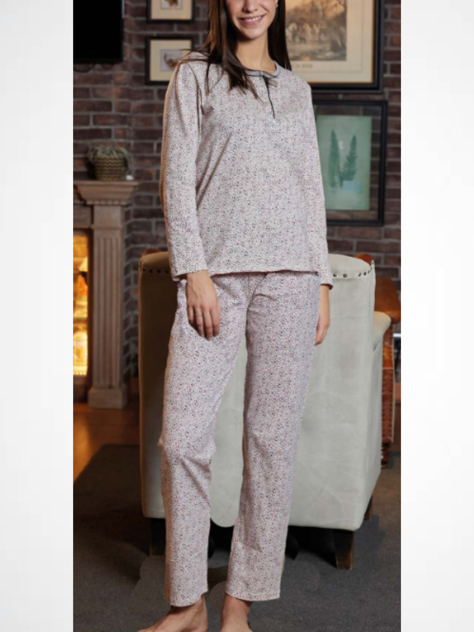 Pijama ideal para entretiempo. Pantalón con estamdo floral y camiseta gris.