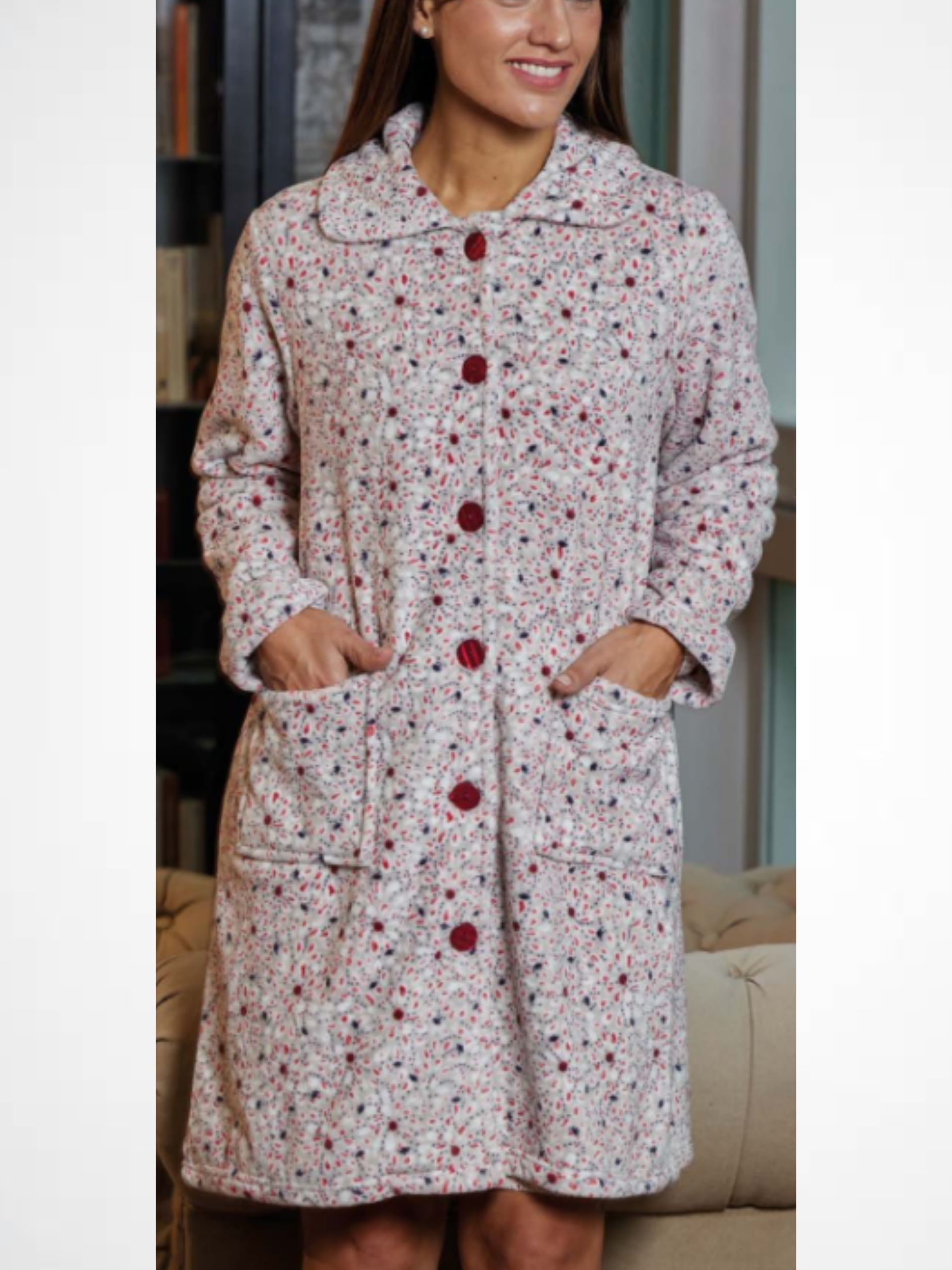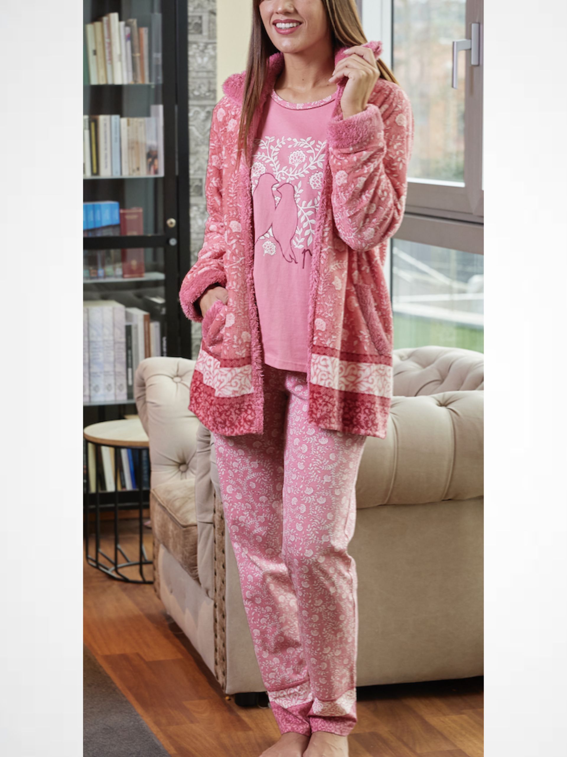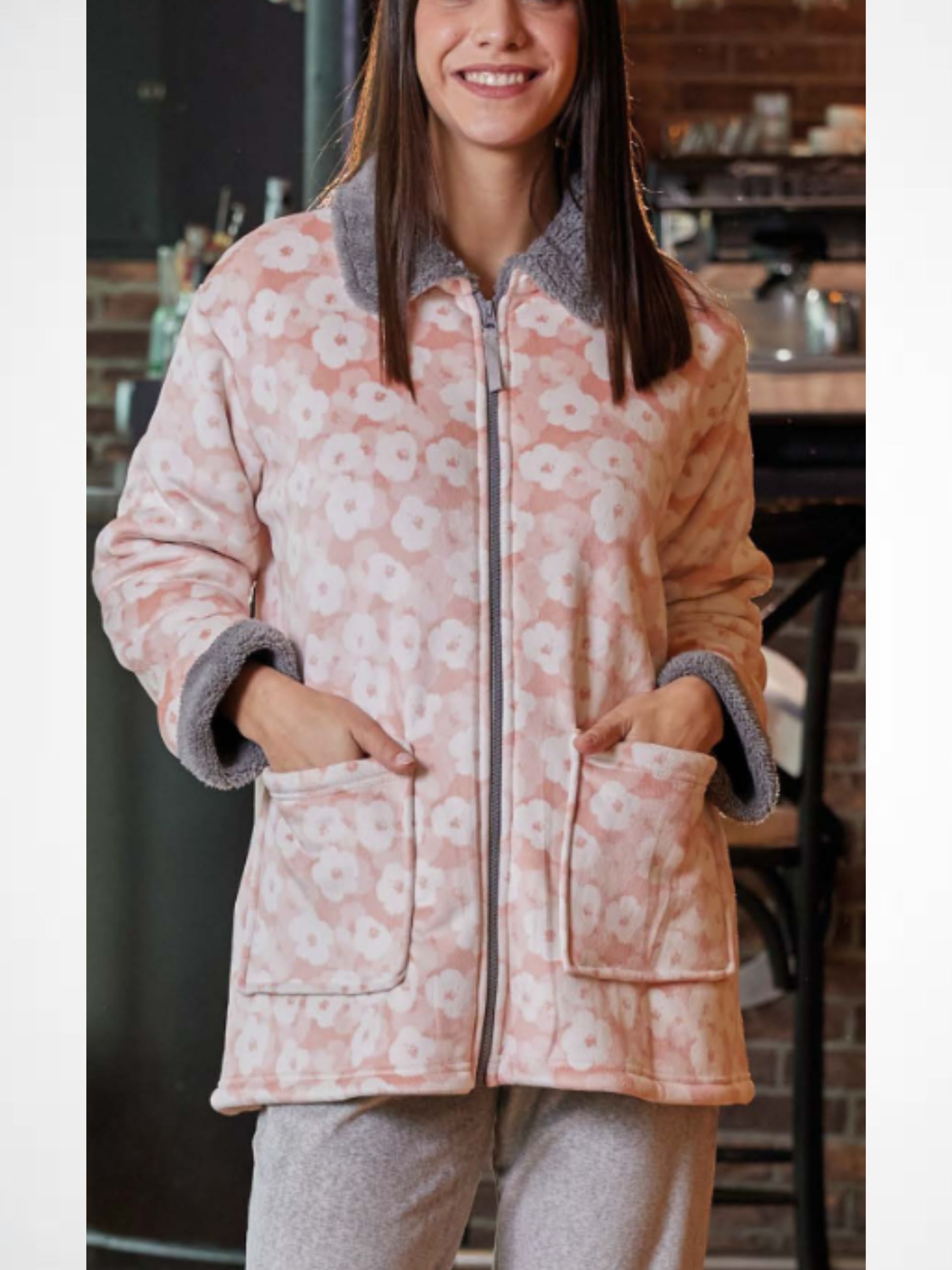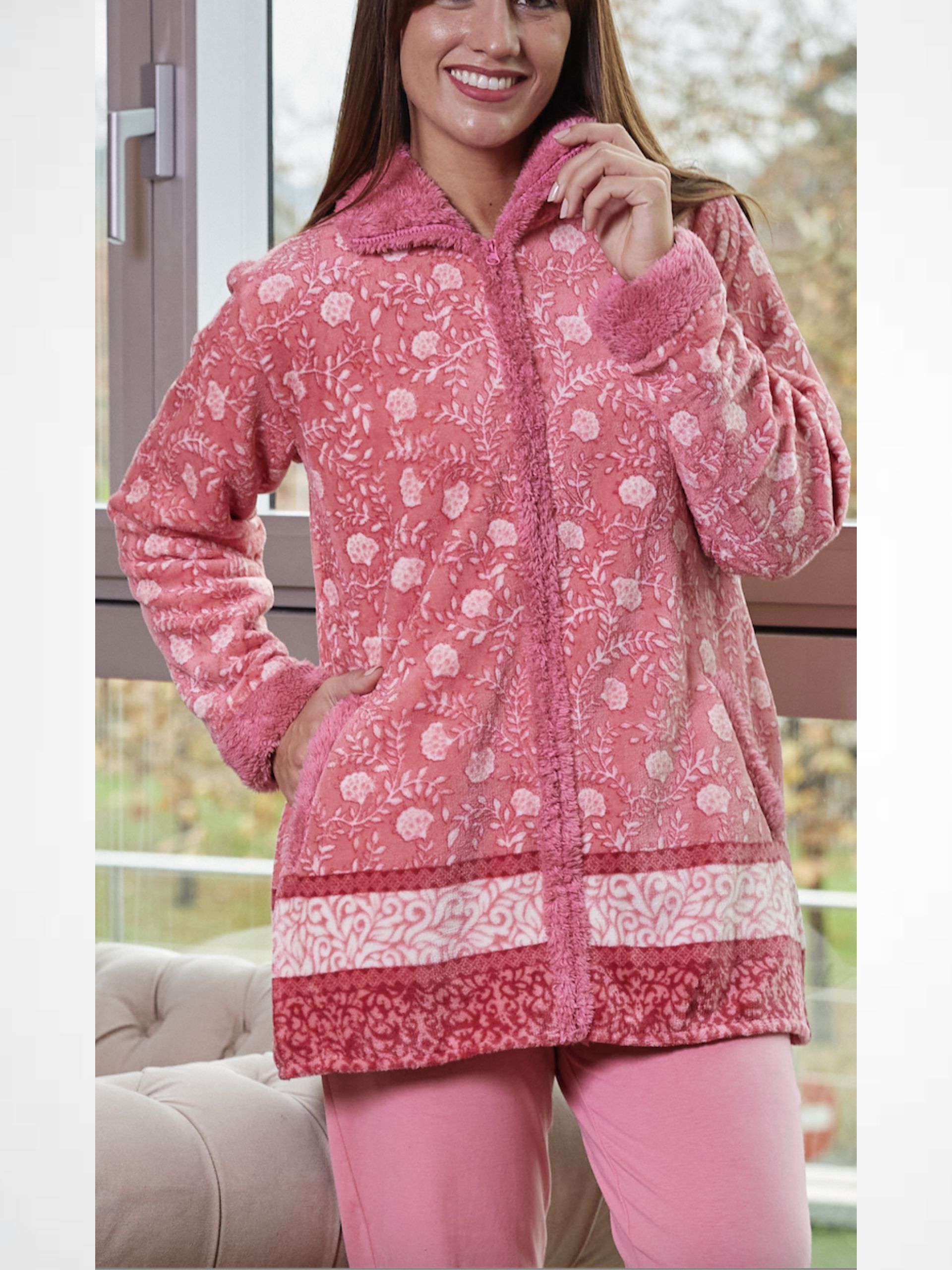 Bata en cálido tejido en coral ultra suave y ligero. Estampado de corazones. Capucha y cierre con cremallera. Combinable con pijama corazones de la misma línea.
