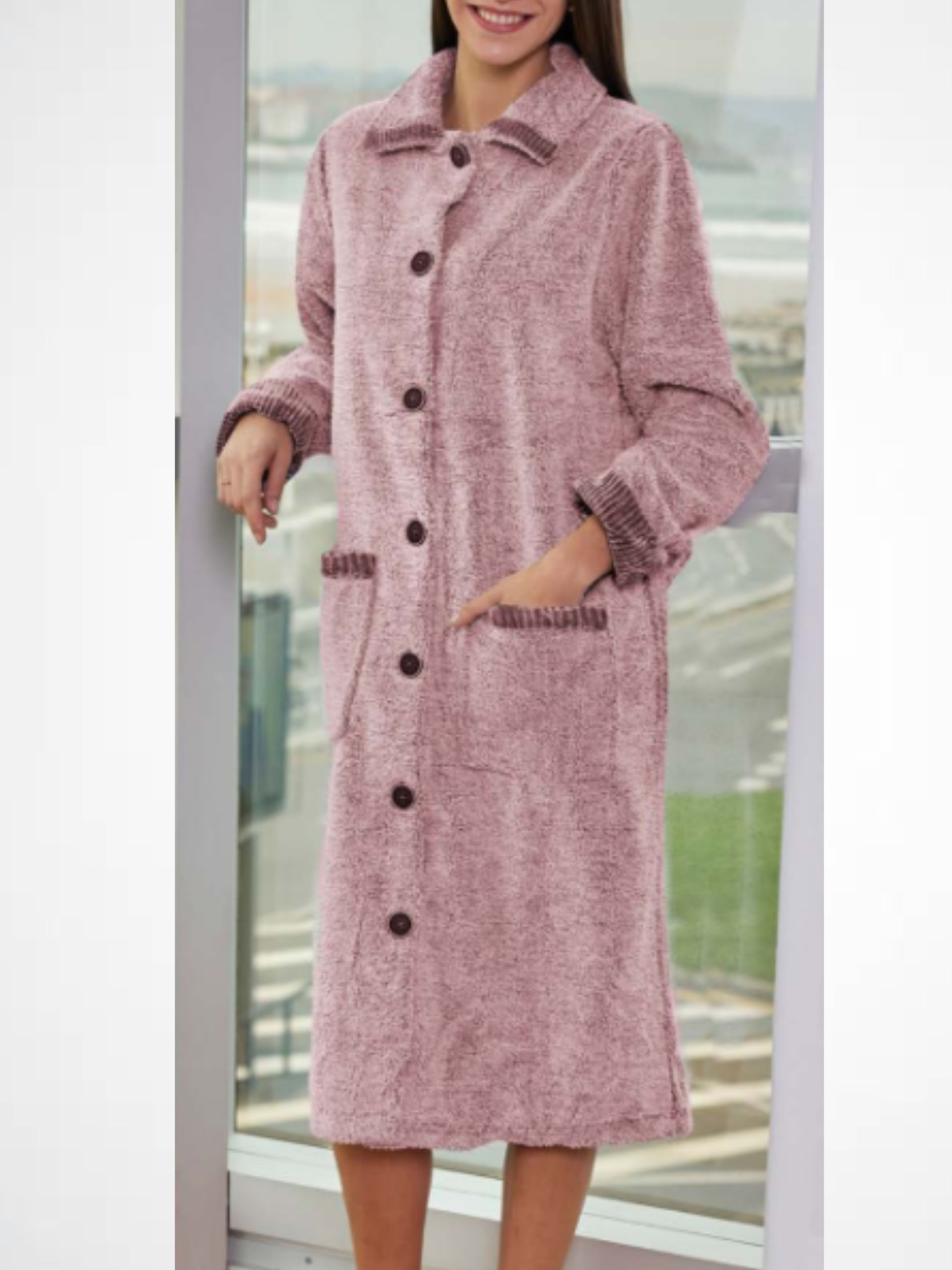 Bata larga cálida coralina rosa muy elegante, anudada y con bolsillos.