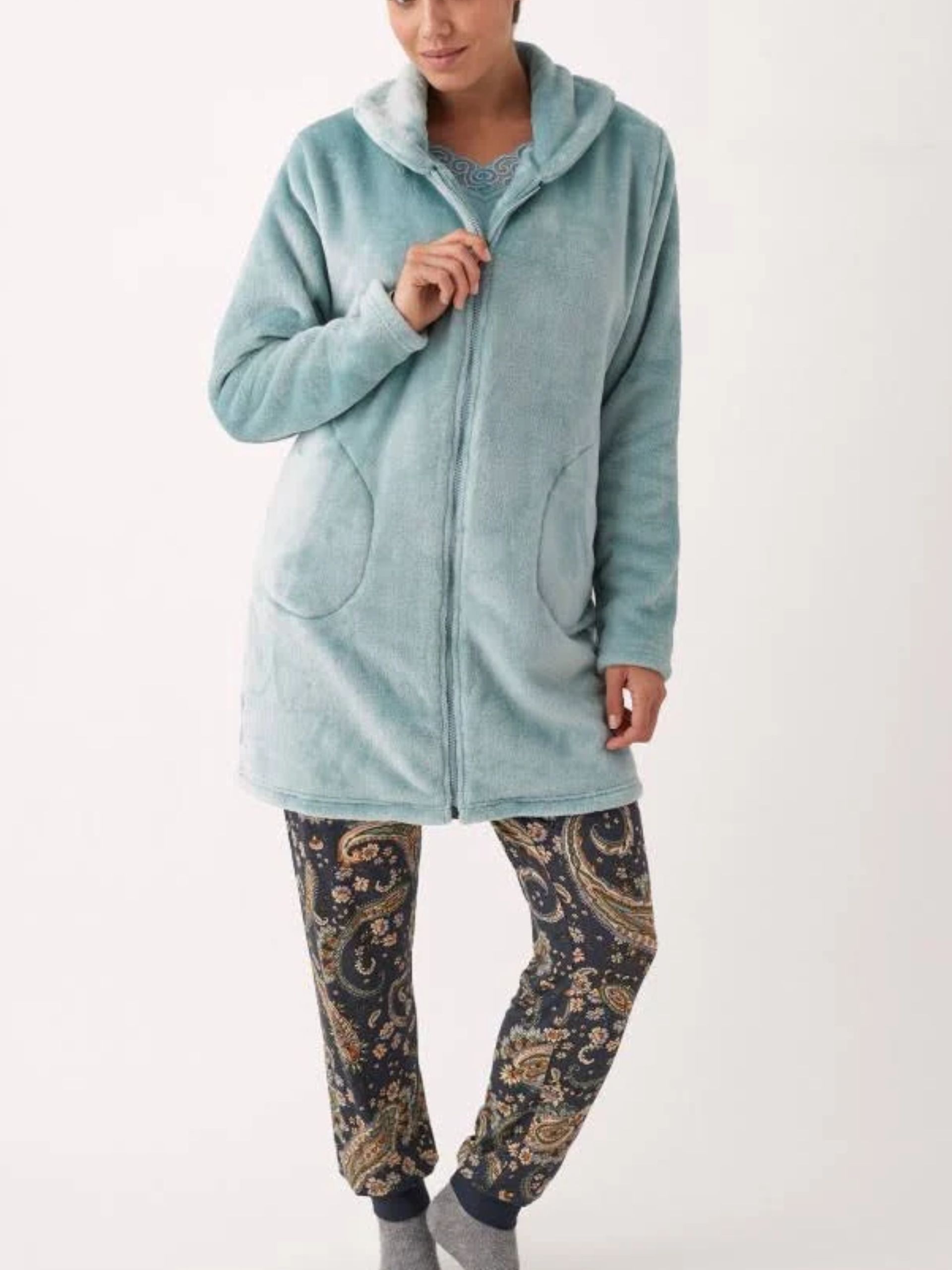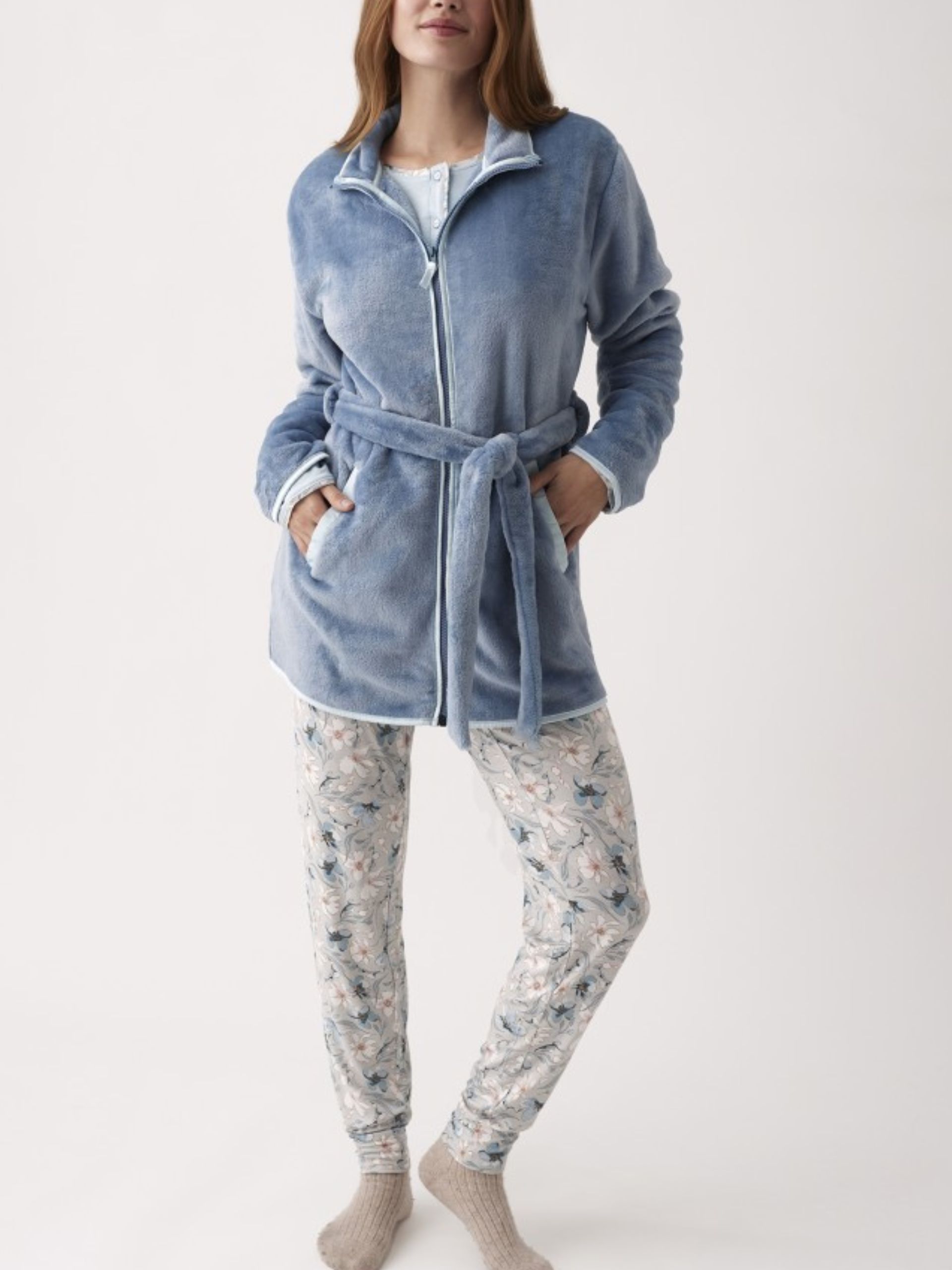 Conjunto bata corta con cremallera y bolsillos laterales a juego con pijama camiseta azul claro lisa cuello tapeta y pantalón con puños.