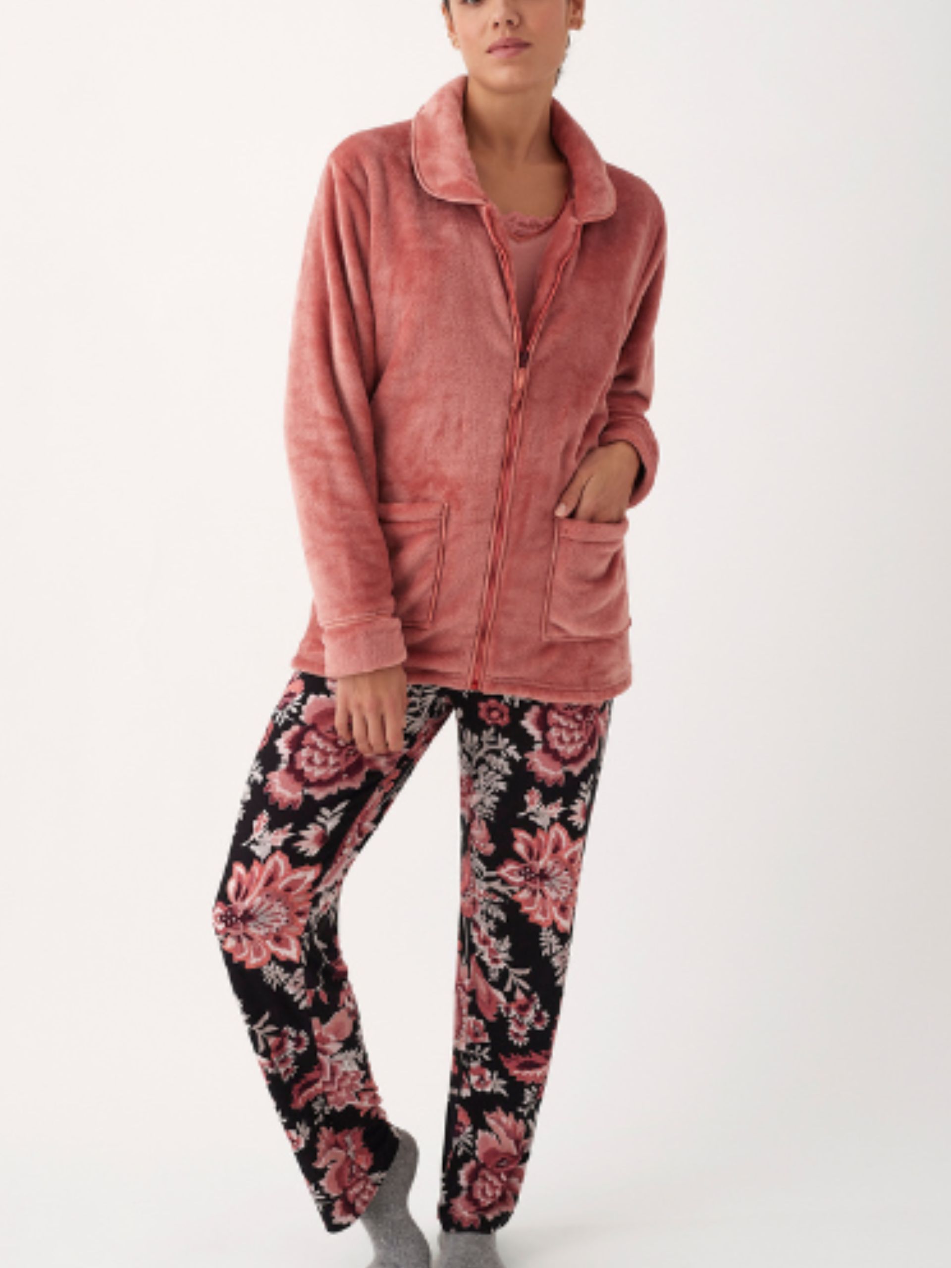 Conjunto bata corta color caldera con cremallera y bolsillos delanteros a juego con pijama camiseta lisa y pantalón estampado.