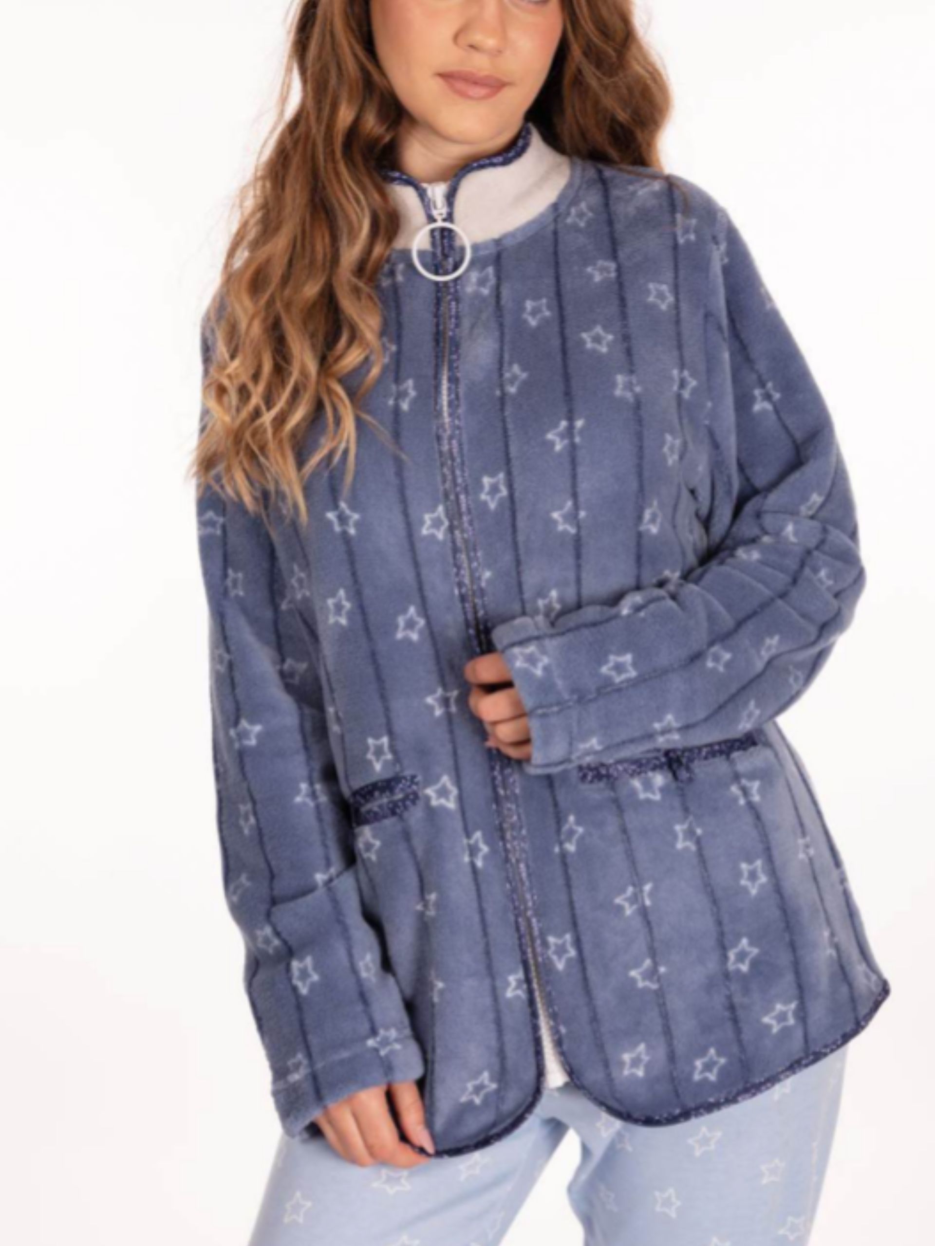 Bata corta estampada tejido coralina extra suave y cálido. Color azul con estrellas blancas. Cierre delantero con cremallera y bolsillos delanteros.