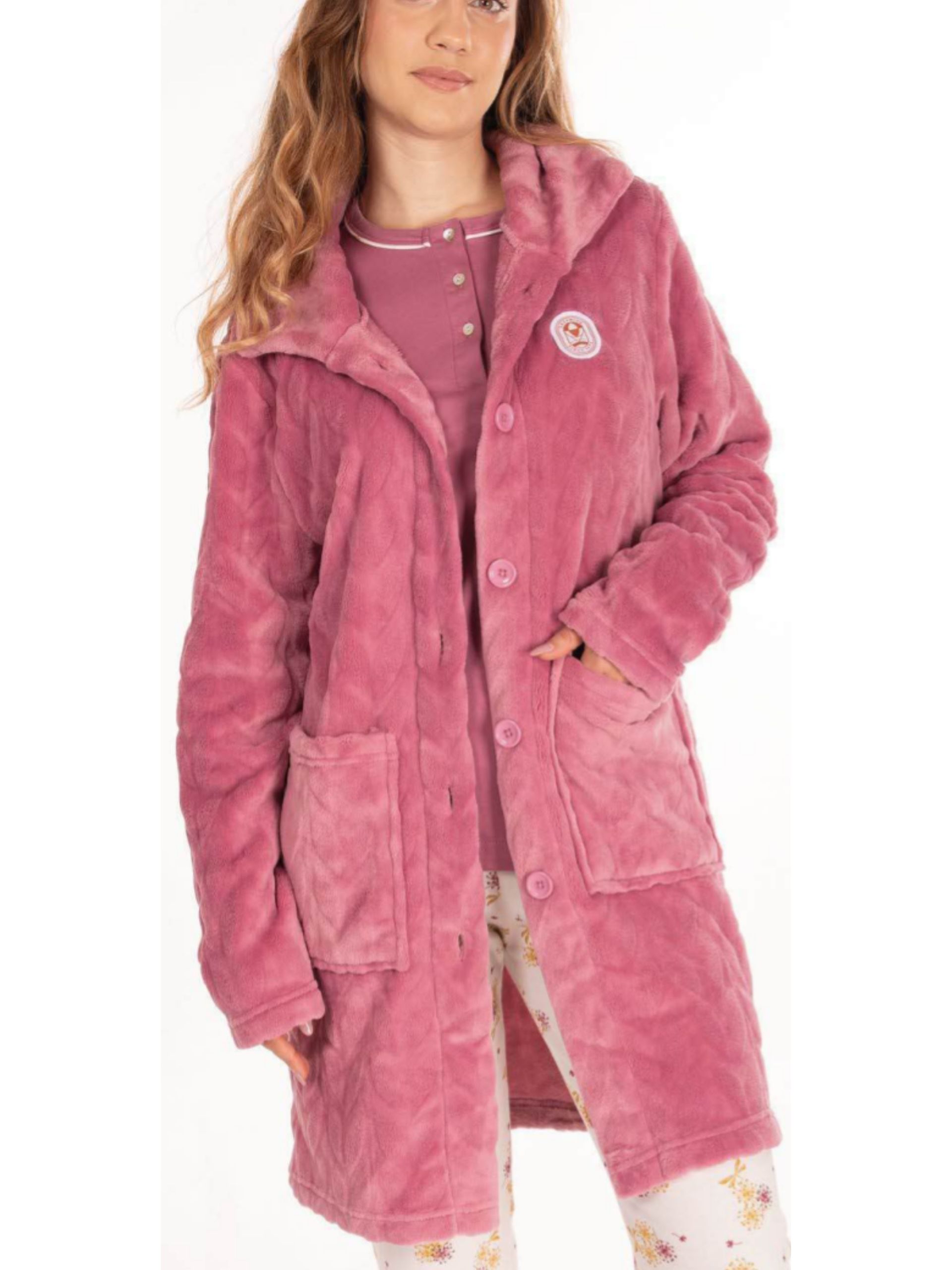 Bata corta de color rosa con cremallera e interior en blanco y con bolsillos laterales y motivo bordado en el pecho.