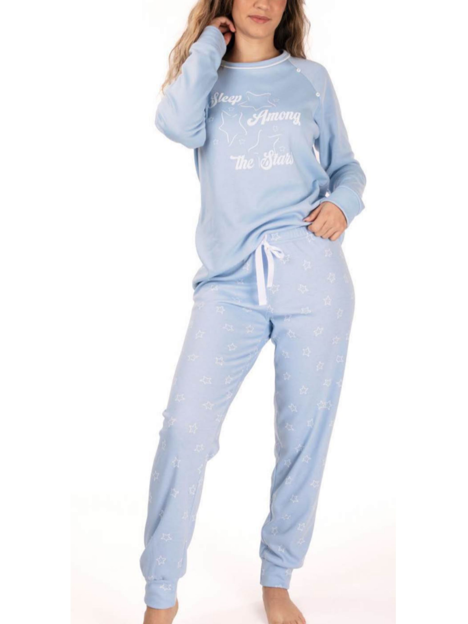 Pijama interlock estampado estrellas blancas sobre azul cielo. Camiseta cuello, pantalón a juego con cintura ajustable y puños en ambas prendas. 50% algodón / 50% poliester.